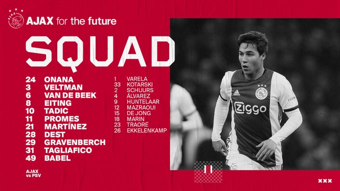 Opstelling Ajax: Onana; Dest, Veltman, Martínez, Tagliafico; Gravenberch, Eiting, Van de Beek; Tadic, Babel, Promes.