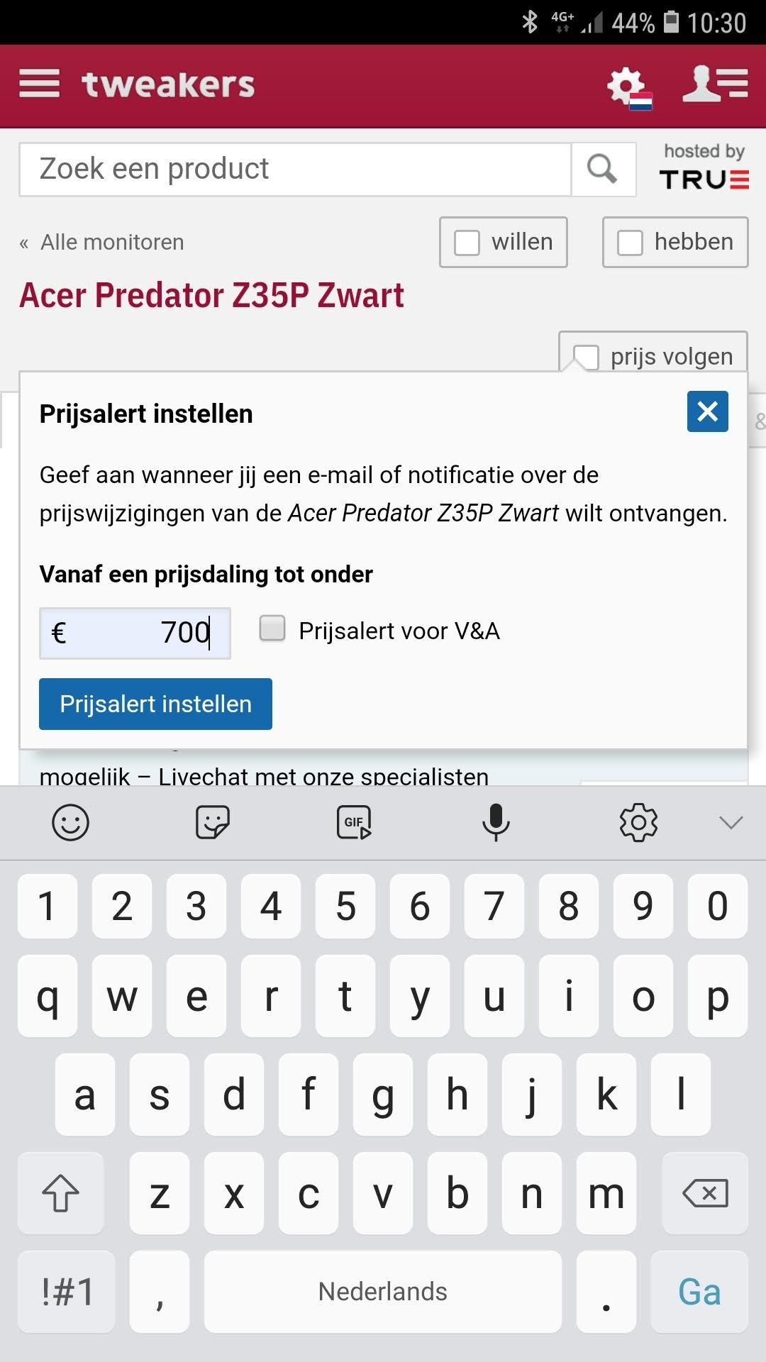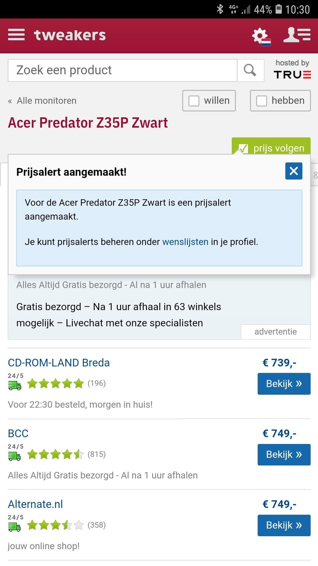 Na het invoeren van een prijsalert krijg je een melding dat je alert is ingesteld en dat je al je alerts kunt beheren via een link; maar die is helaas op vakantie, want geeft een 404.