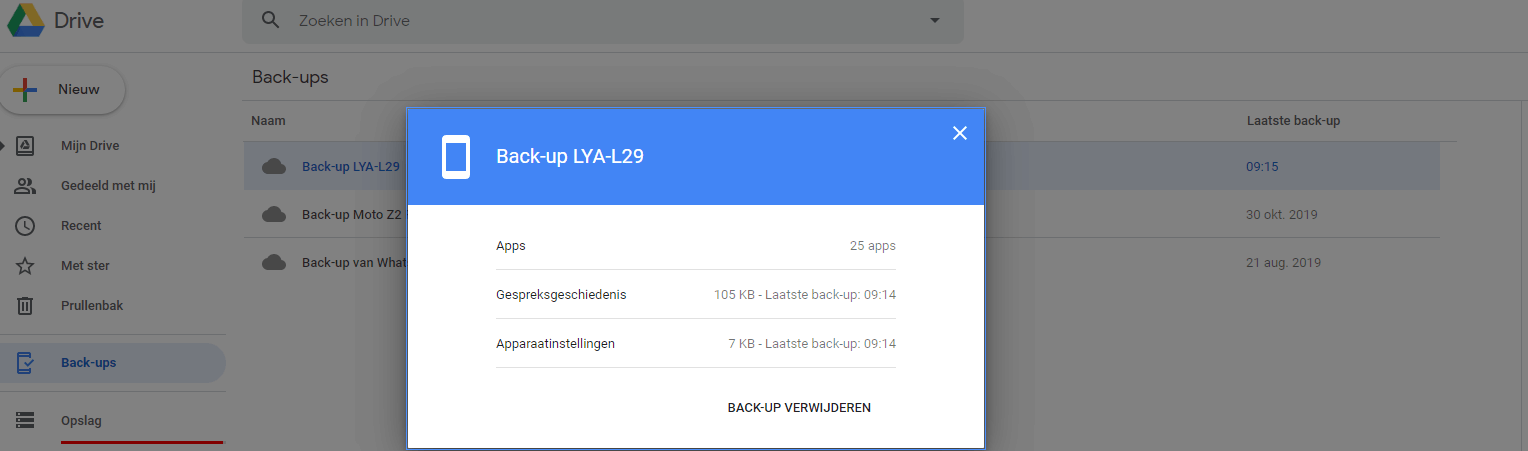 Ik wil een back-up in de map BACK-UPS bij Google Drive verplaatsen naar een lokale schijf.