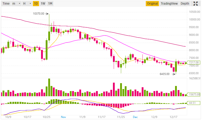 Bitcoin is op 7270 USDT (+-MA25) afgeketst, als je naar onderstaande plaatje kijkt kon je daar al wel redelijk van uitgaan (zie ook mijn quote van gisteren). Nu is de vraag of het bij een volgende poging wel lukt er doorheen te breken, zo ja, dan kan het weer mooi richting de >8000 regionen. Lukt dit niet snel, zal Bitcoin waarschijnlijk nog 1 of meerdere keren op de 7000-7050 afketsen om daarna weer omhoog te gaan. Uiteindelijk zal of de MA25 (roze) of MA7 (geel) met veel volume worden doorbroken.Taro schreef op zaterdag 21 december 2019 @ 22:18: