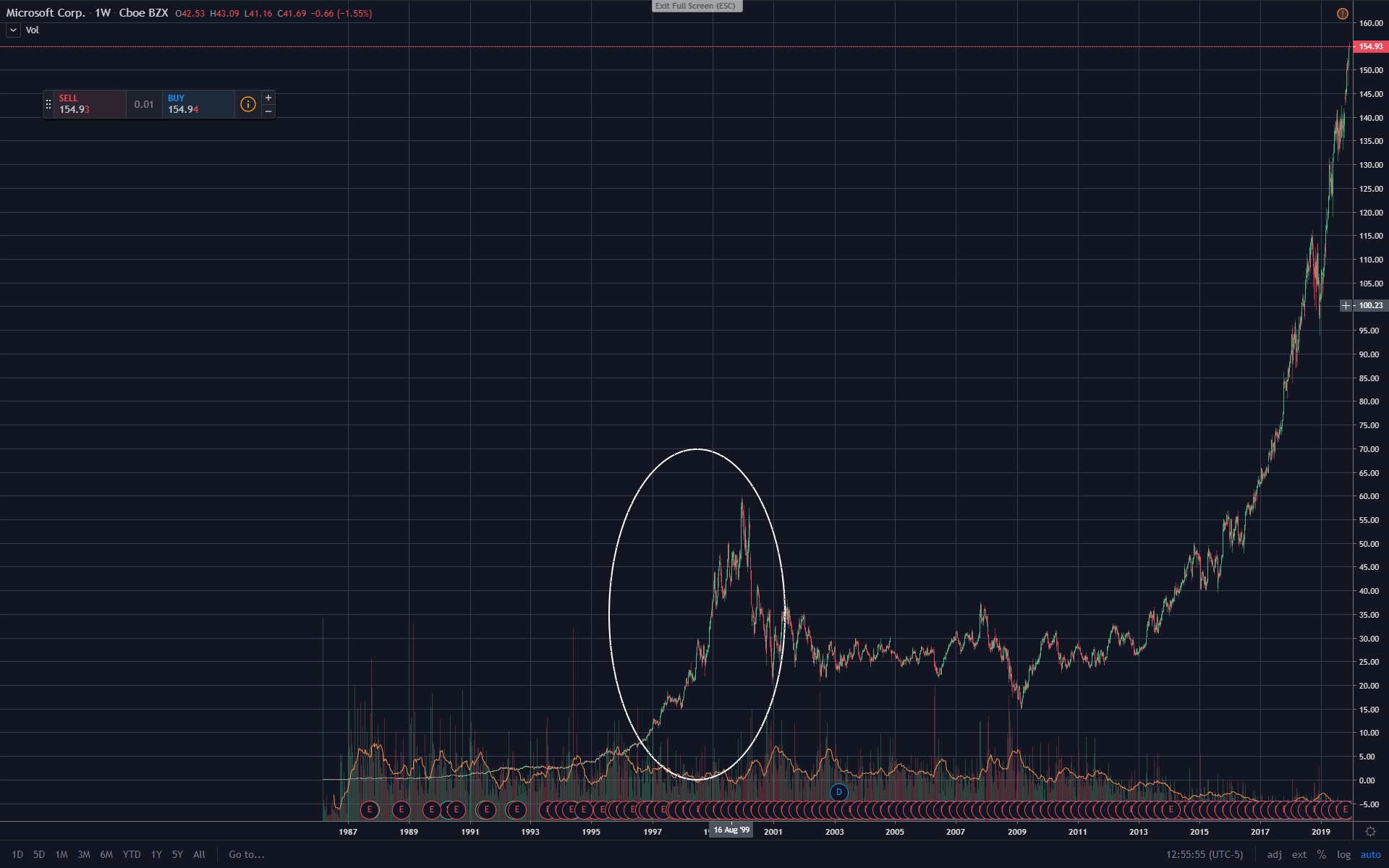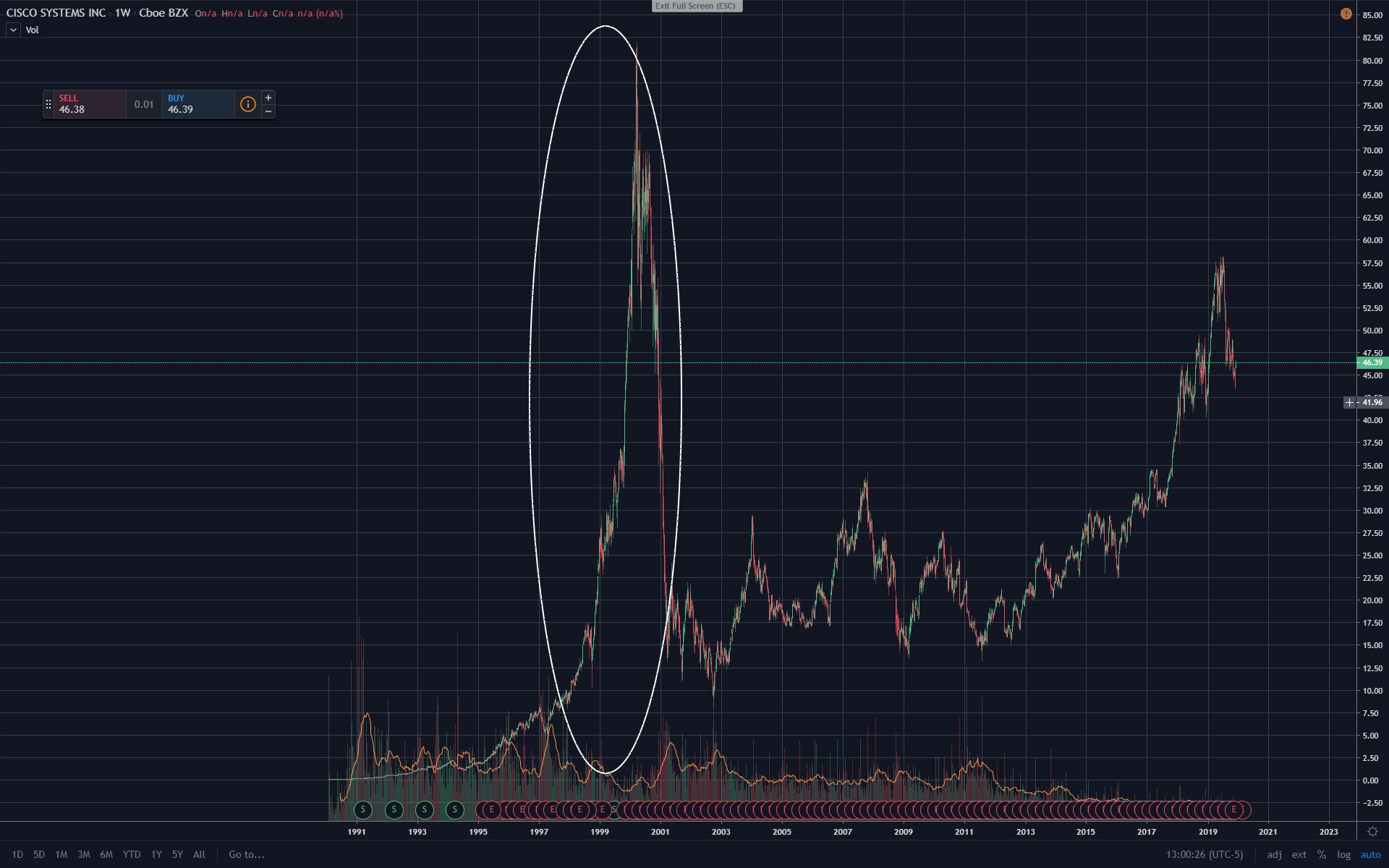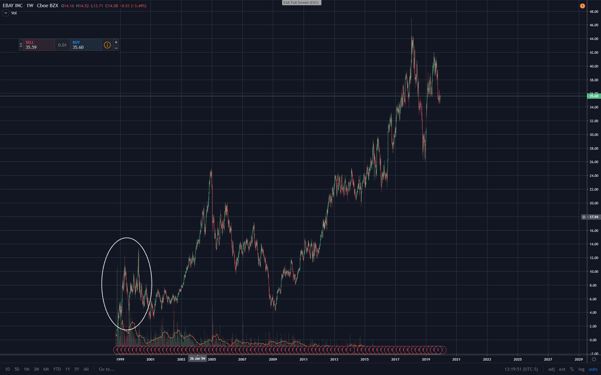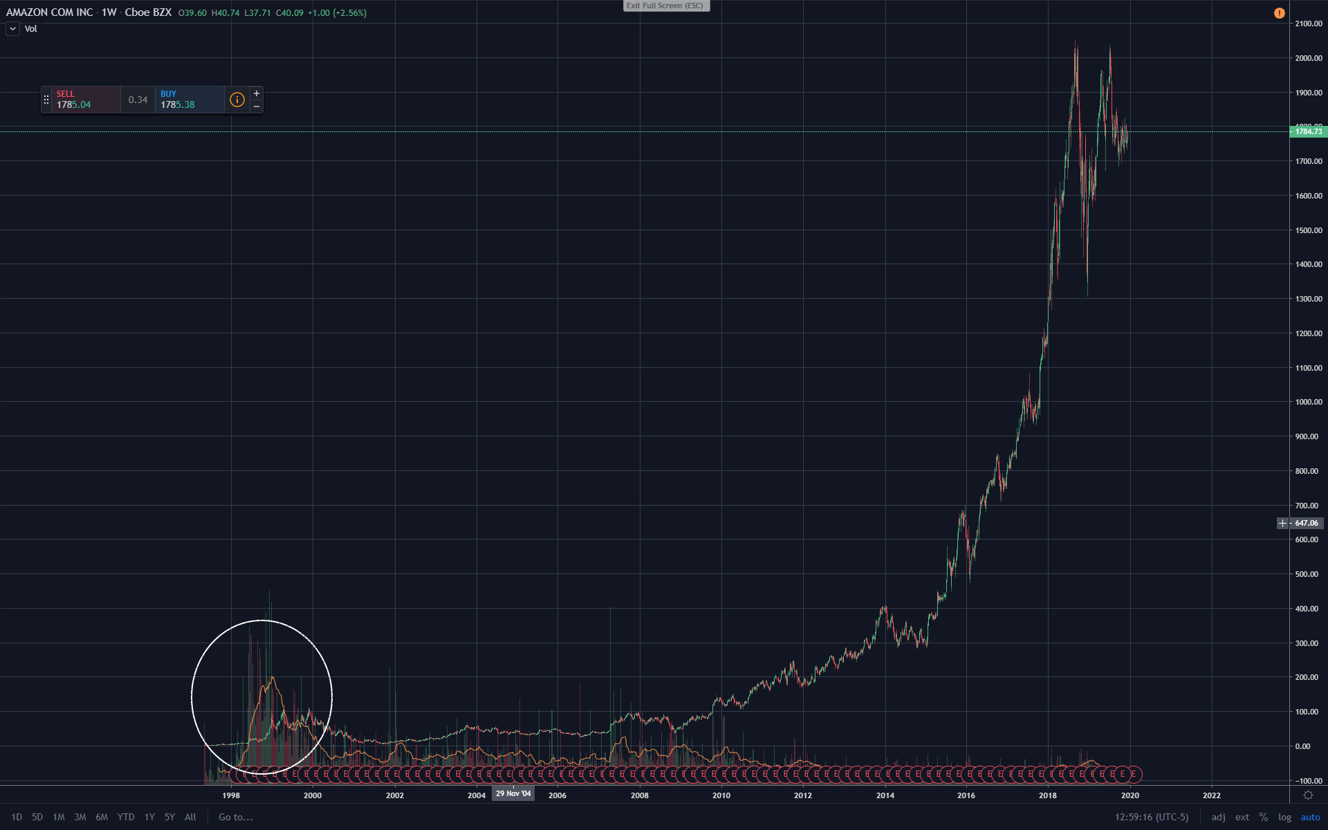 Heb even een paar charts onder elkaar gezet met de dotcom bubble van bedrijven die nu nog bestaan (Tuurlijk is 99% van de startups in de periode van 1997 tot 2000 van skyrocket naar die zien we nooit meer terug gegaan)