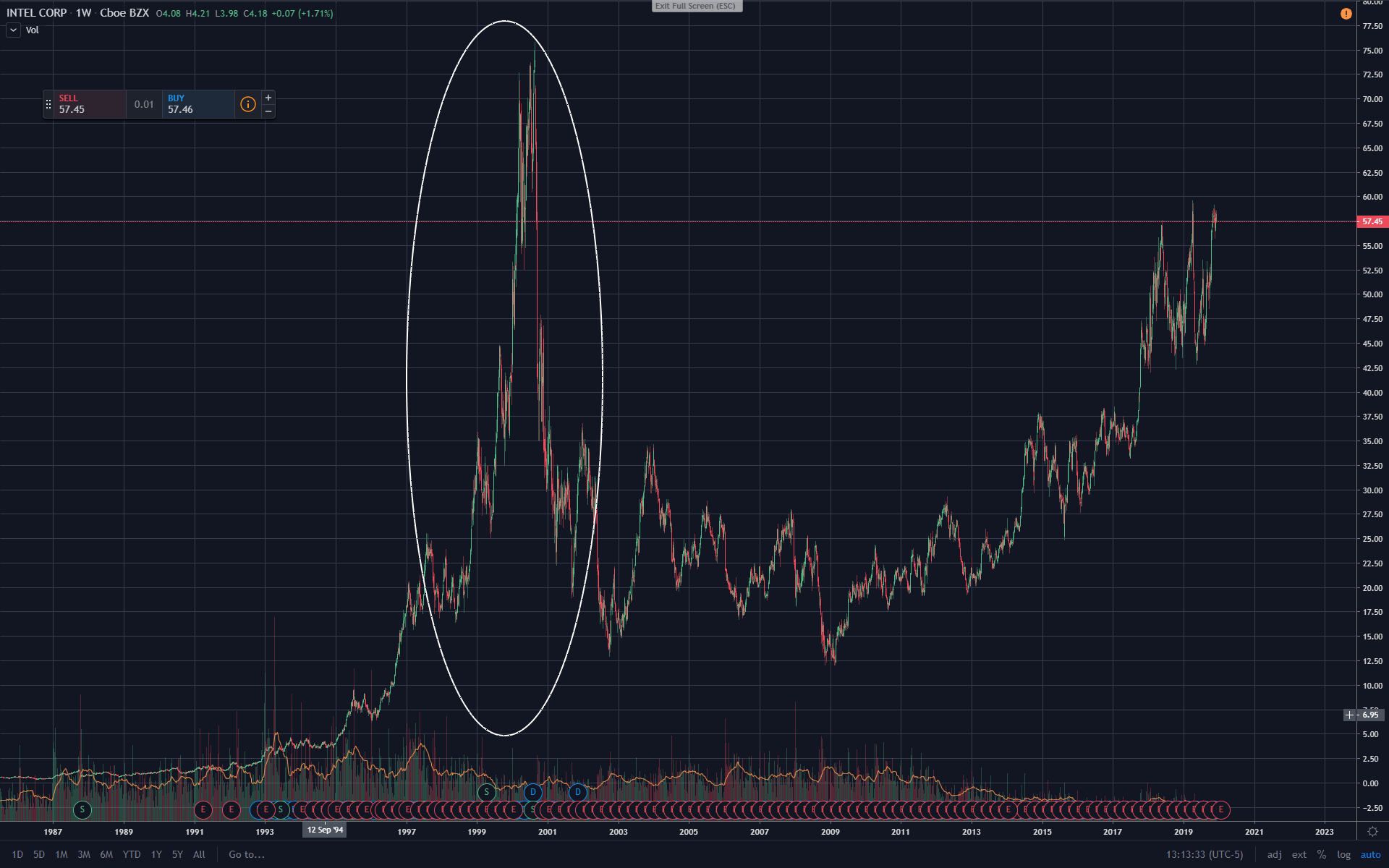 Heb voor de "leuk" even wat grafieken op een rij gezet van bedrijven die de Dotcom bubble hebben overleeft en waar het bij sommige bedrijven zelfs toch nog (aardig) goed gekomen is als je maar lang genoeg gehodlt hebt.