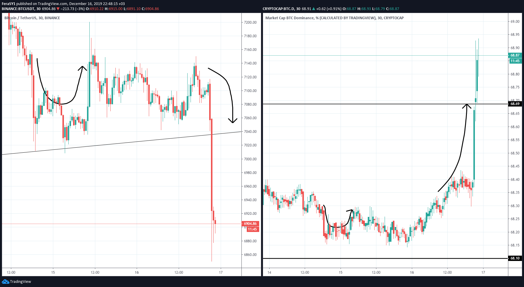 Ik zie de value van scalpen wel. Ik denk dat ik het ook wel zou kunnen. Of iig kunnen leren. Wat je denk ik heel goed moet zien is wanneer een trend gaat omkeren. Zoals we vanmiddag zagen. Ik zag de trend omkeren. We kregen een kleine bounce omhoog en toen volgde rejection (op BTC). Ik had toen eigenlijk al uit moeten stappen. En dat realiseerde ik mij op dat moment ook al. Maar ja. Zoals mensen zo vaak de fout maken; je denkt dat de trend wel weer in jouw voordeel gaat spelen. Maar dat is niet zo. Je ziet rejection. Dat is altijd echt ALTIJD een teken van zwakte. Had ik daar mijn positie inderdaad gewoon gesloten dan had ik een plukje winst gehad. Veel was het niet, maar hey winst is winst. En nu ben ik uitgestopt. Jammer. Maar een les geleerd. Eentje die ik eigenlijk al had MOETEN weten, en eigenlijk ook wel wist. Maar dat is mooi om te zien dat ik het wel herkende, nu alleen nog niet zo koppig zijn soms