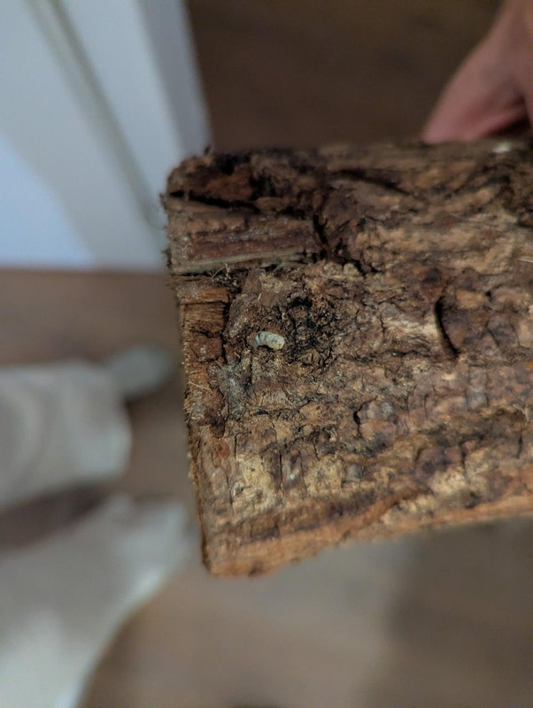 Dit lijkt mij een larve van een boktor. Ik heb het hout direct buiten gelegd.