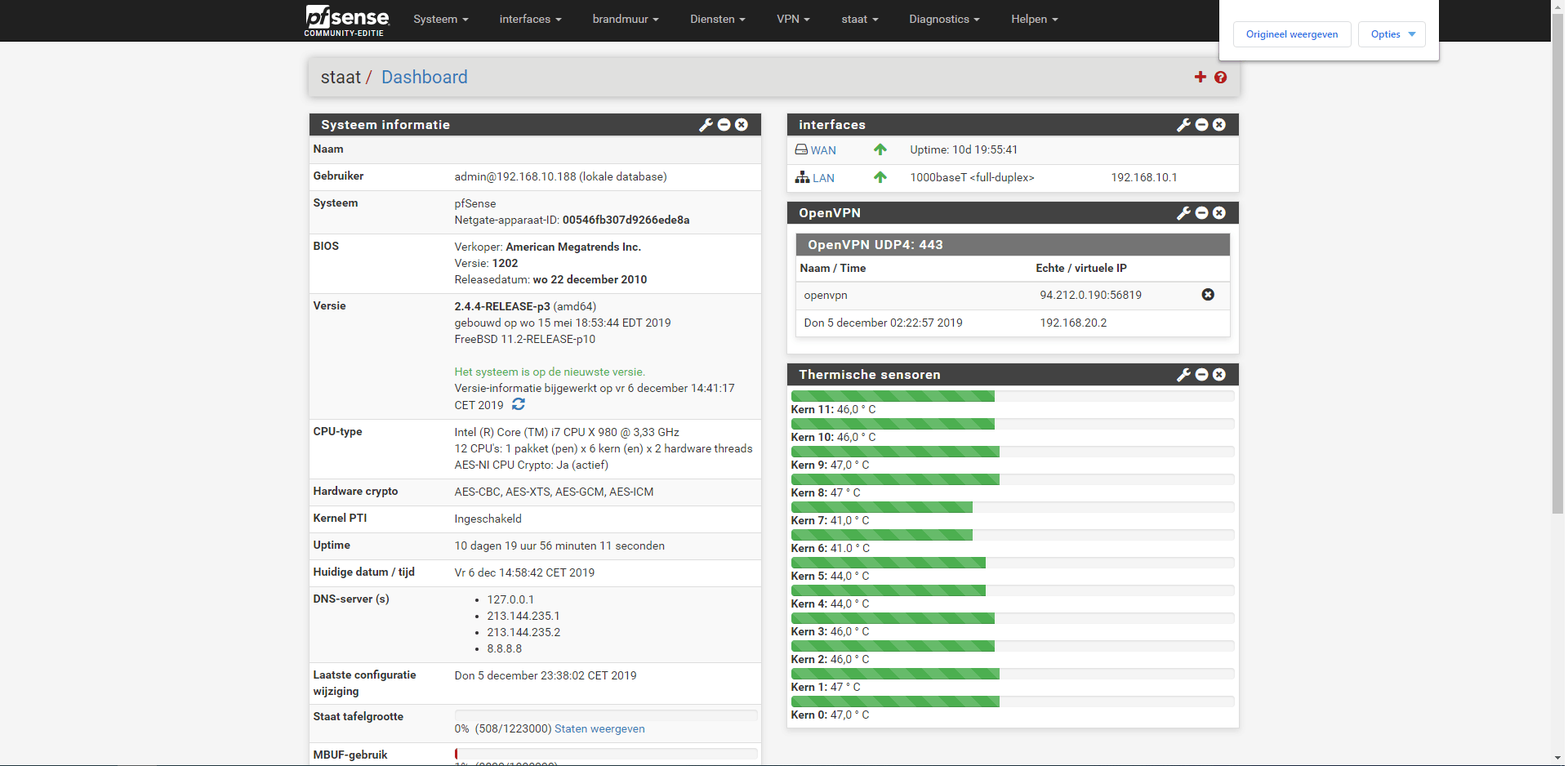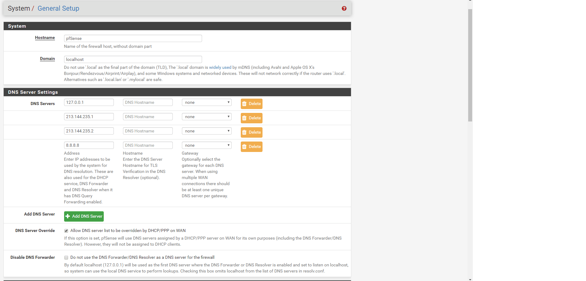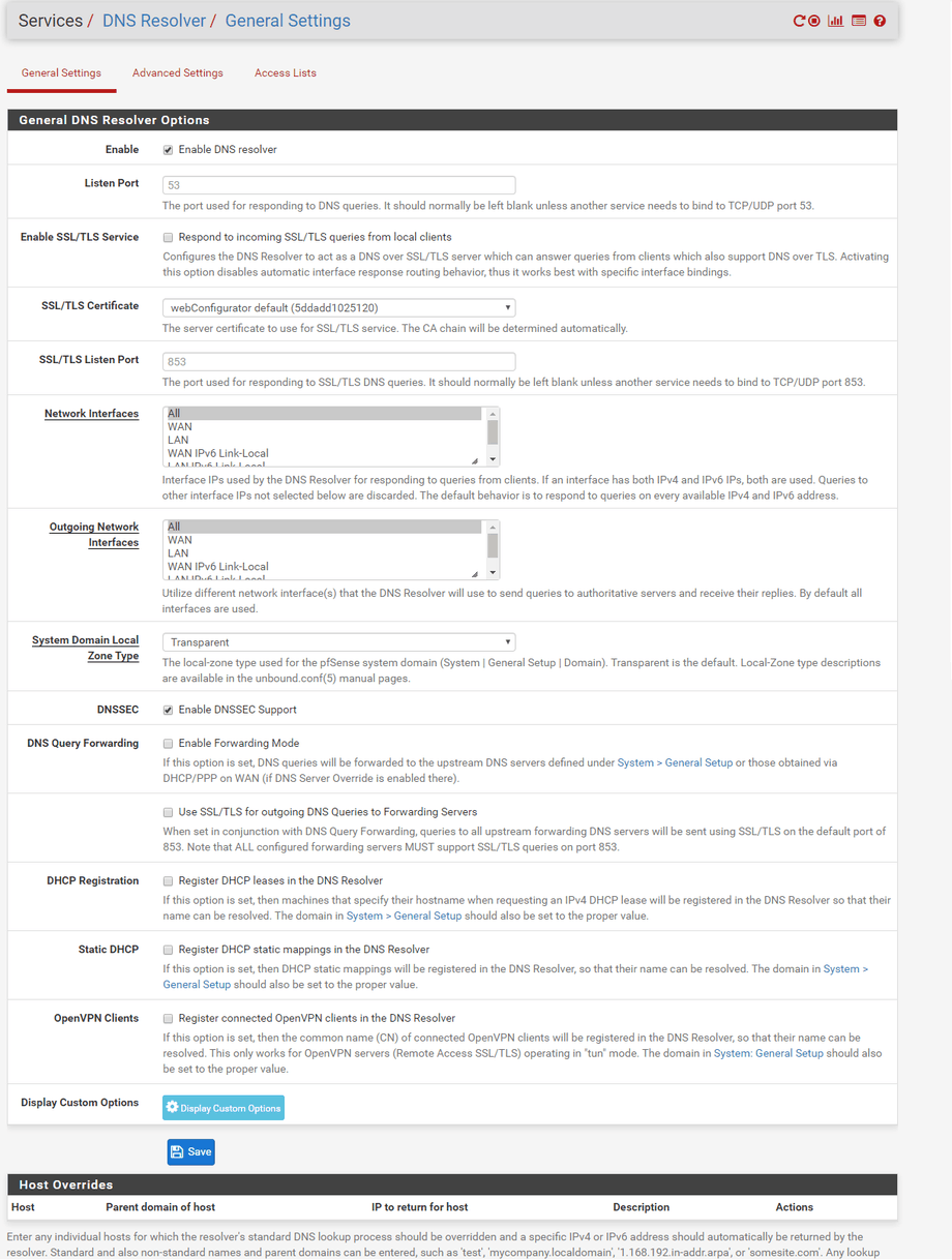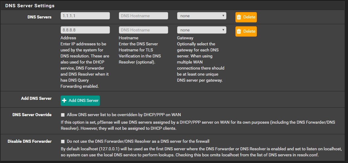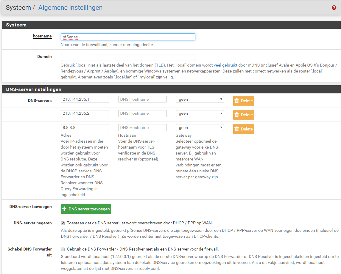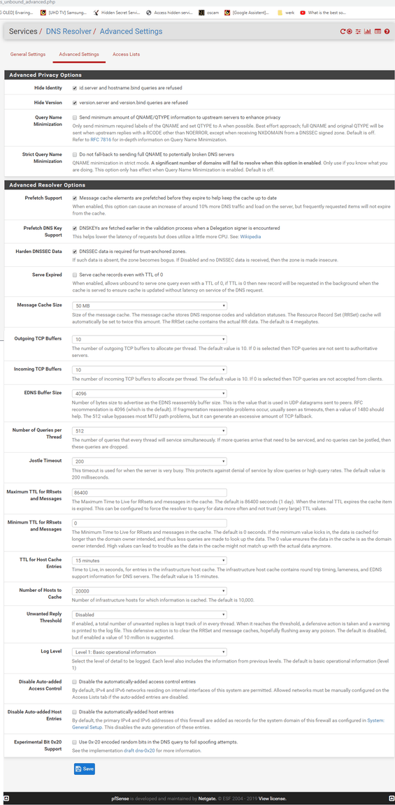 Ik heb een PC bij mij in huis staan waar ik Pfsense op draai met mijn galsvezel verbinding van 500/500. In de pc zit een I7 980x extreme edition met 12 gb geheugen en een Samsung ssd. Nu heb ik het volgende probleem als ik naar websites ga dat er in Chrome vaak staat host vaststellen en dat het 1 a 2 seconden in beeld staat voor de site geleden word. Als ik op mijn pc de zelfde dsn server bij netwerk instellingen in Windows 10 instel dan die er in de Pfsense ingesteld staat dat site veel sneller laden en er nooit in chrome staat host vaststellen. Ik gebruik de DNS Server van mijn internet provider Helden van nu.Zowel in Windows 10 als in de Pfsense. Ik heb hier door het idee gekregen dat er niks mis is met de DNS Server van mijn internet provider. Ik heb zelf het idee dat er in PFsense wat fout ingesteld staat.