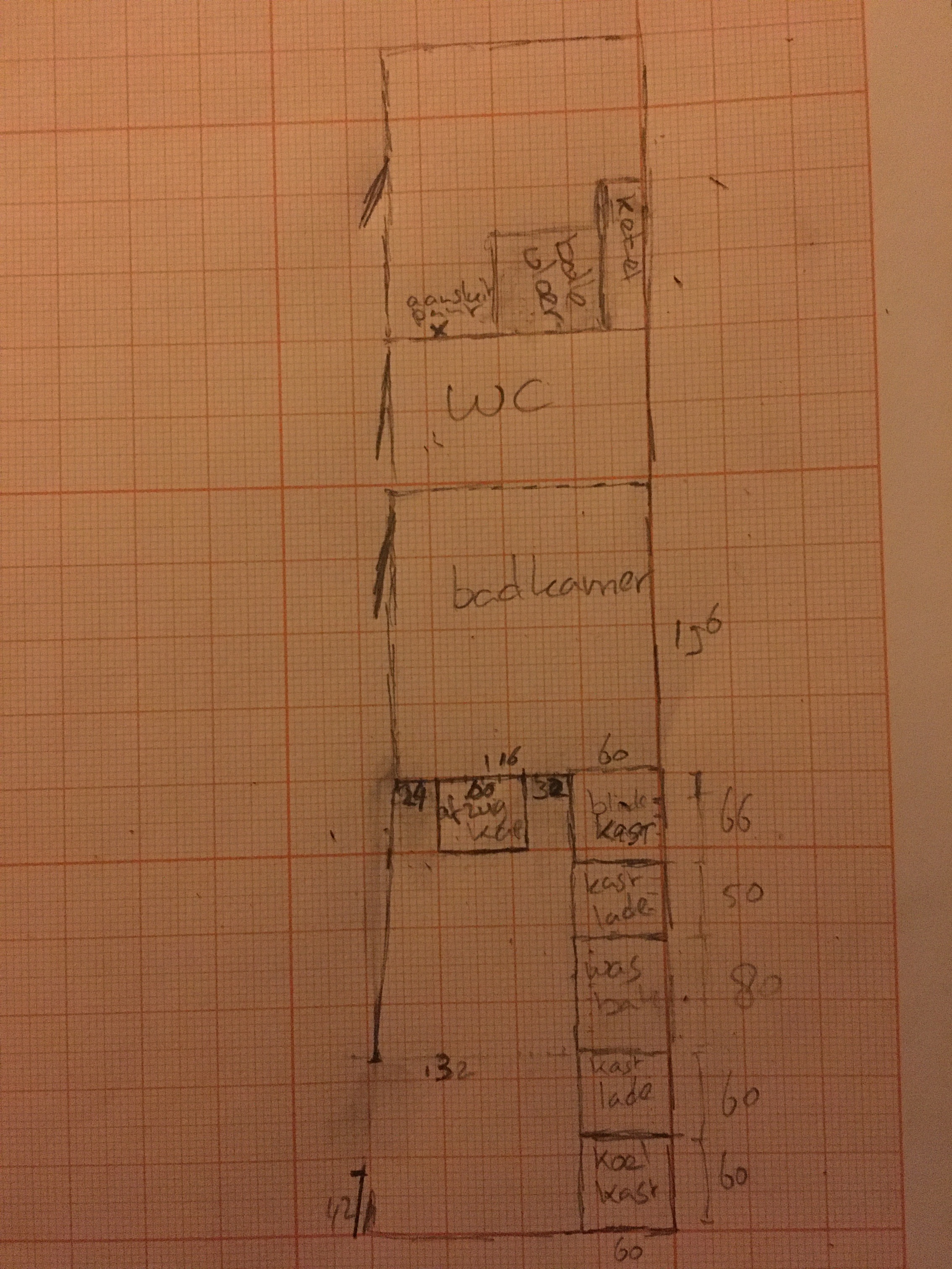 De onderste ruimte is de keuken: half-open, met aan de linkerkant een half hoge muur die schuin loopt: bovenin is de breedte tot aan de keukenkastjes 116cm, bij de deur is de breedte 132 cm. Het bovenste keukenkastje is een kastje zonder deur: daar kun je alleen bij via het keukenkastje daaronder. Daarboven hangt wel een keukenkastje met dubbele deur.