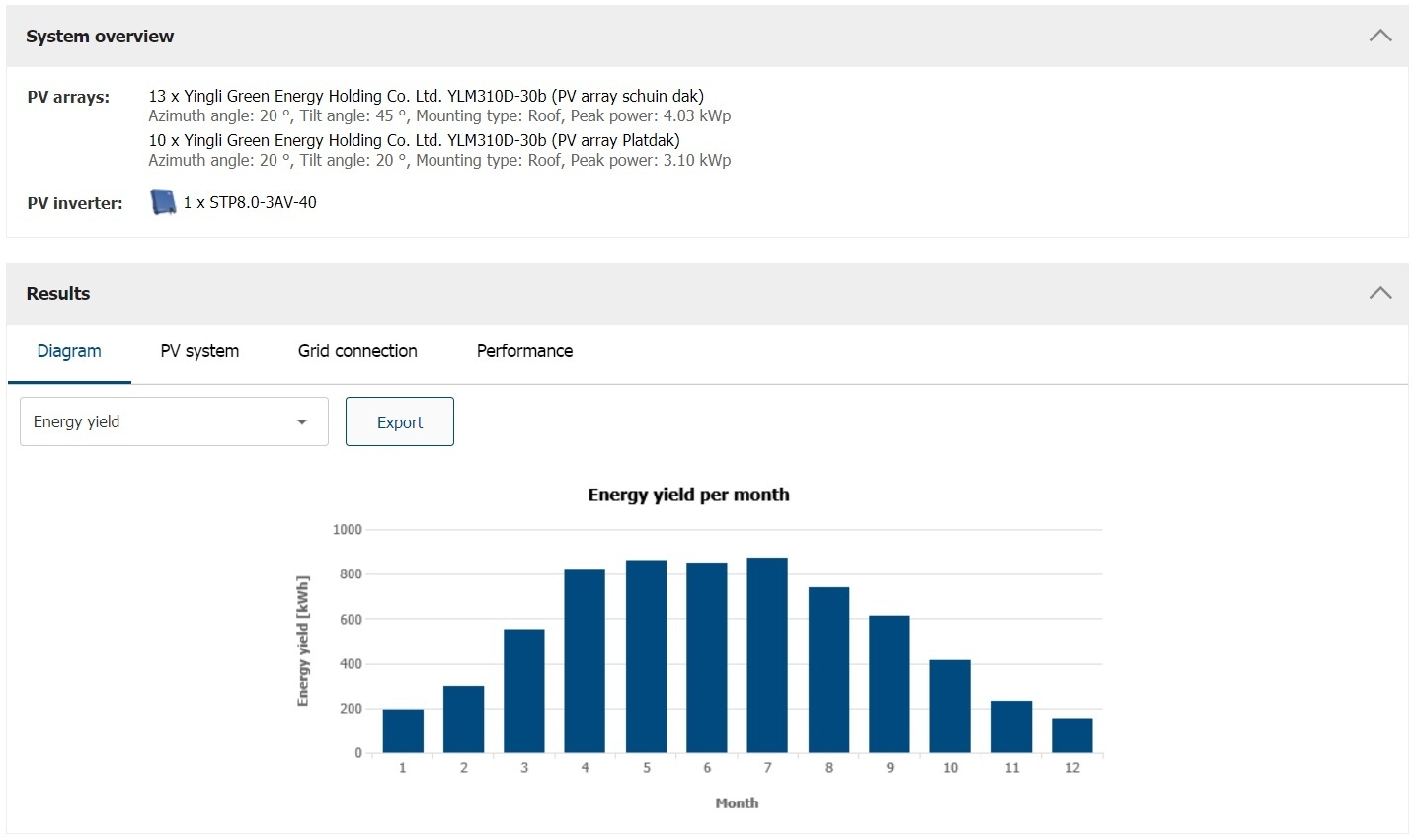 De opbrengst komt in de buurt van 8500 kWh per jaar.