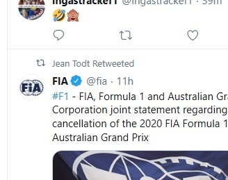 Meneer had wat teveel gedronken en toen ie wakker werd retweette hij of zijn PR team maar het FIA statementnachtnet schreef op vrijdag 13 maart 2020 @ 11:48: