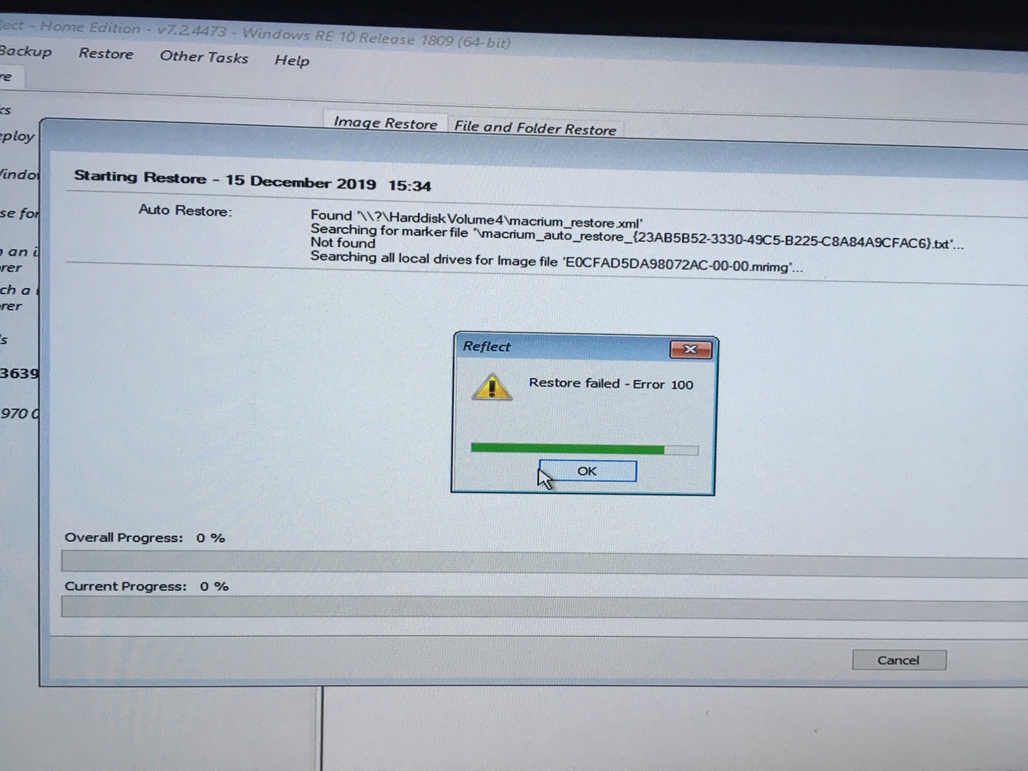 Tot nu toe heb ik nooit iets hoeven te restoren, maar omdat de update van mijn vpn client problemen heeft veroorzaakt, wilde ik vandaag (voor het eerst dus) een image restore uitvoeren, maar dat blijkt te resulteren in Error 100.