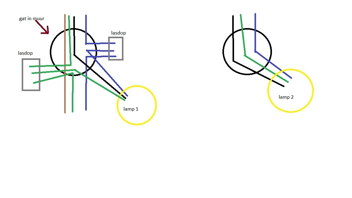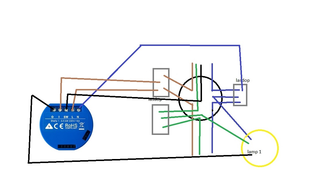 Mijn gedachte is, om achter lamp 1 de Shelly te plaatsen, volgens dit schema: