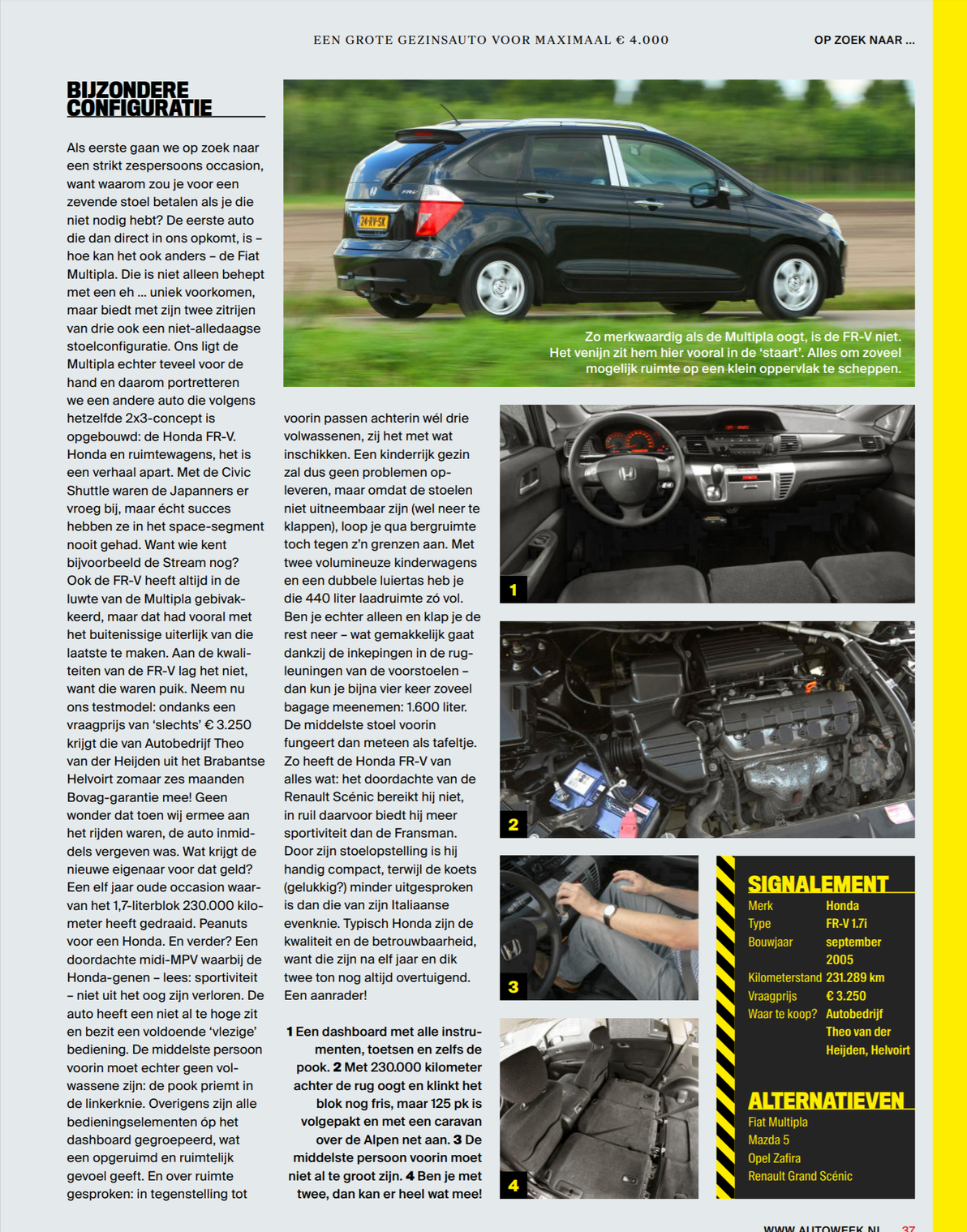We hebben momenteel een Toyota Avensis Verso, we willen opzich wel een slagje kleiner gaan rijden en ik stuitte laatst op de Honda FR-V. Honda staat bekend als zeer betrouwbaar en ik vind het persoonlijk wel een leuke verschijning.