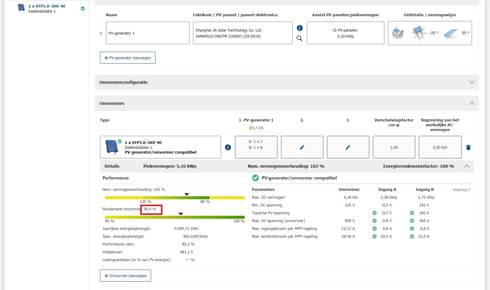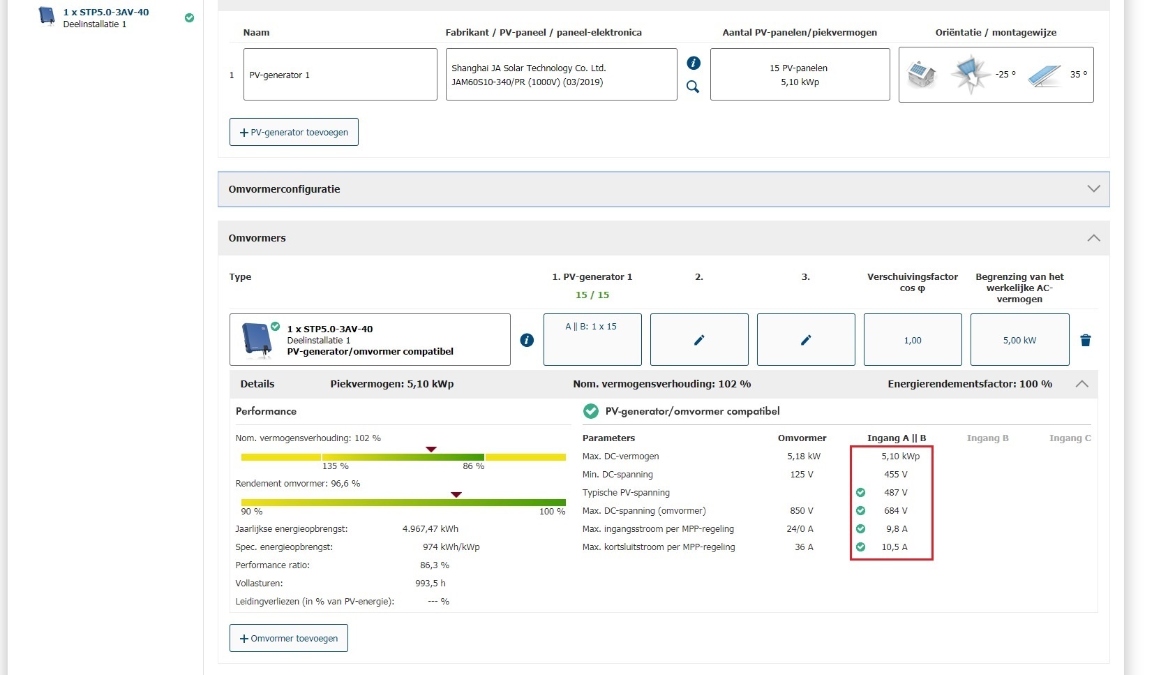 15 * 34,63 plus 15% voor het compenseren van thermische effecten kom ik op 597 V. Dus prima in de range van de omvormer.