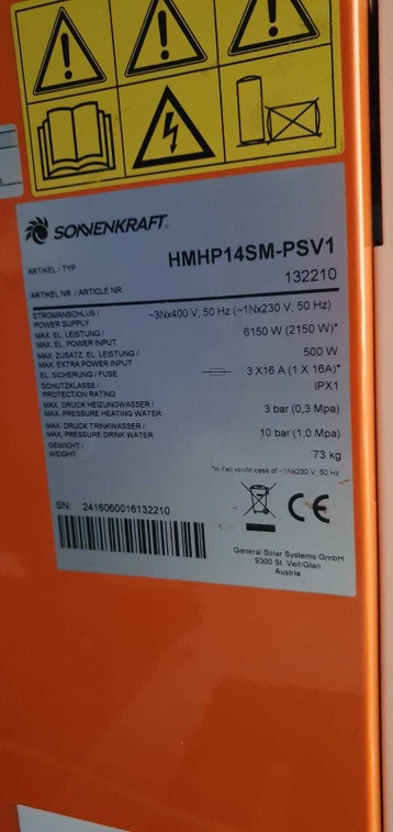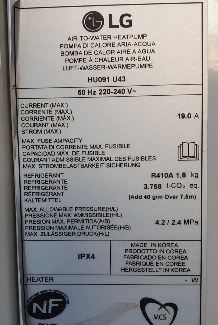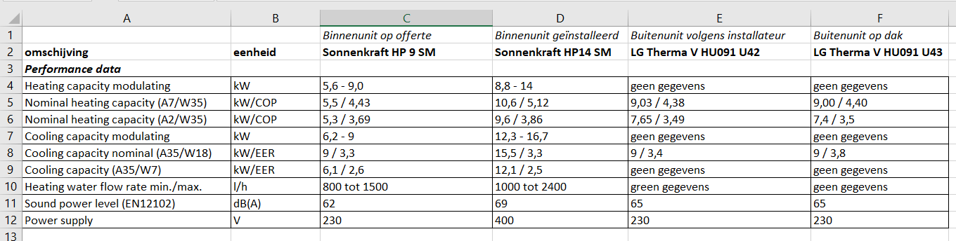 Volgens de offerte zouden we een Sonnenkraft SM9HP warmtepomp krijgen. De binnenunit is inderdaad een Sonnenkraft, maar volgens het typeplaatje is het de SM14HP, dus een capaciteit van 14kW in plaats van 9kW. De buitenunit is, volgens de installateur een LG Therma V HU091 U42, maar we zijn vandaag het dak op geklommen en op dat typeplaatje staat HU091 U43. Volgens de installateur komt LG en Sonnenkraft uit dezelfde fabriek en maakte het geen enkel verschil. Wij zijn niet voldoende thuis in de materie, en als we de specificaties naast elkaar leggen dan komen we er niet echt uit of het inderdaad geen verschil maakt. We hebben er eigenlijk te weinig verstand van. Waar we ons vooral zorgen over maken is of een binnenunit van 14kW wel combineert met een buitenunit van 9kW.