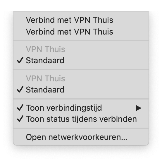 De VPN-verbindingen verschijnen regelmatig ook dubbel in beeld. Ik heb het probleem ook bij Apple in de communities gedropt, maar nog geen oplossing. Zie: https://discussions.apple.com/thread/251010259