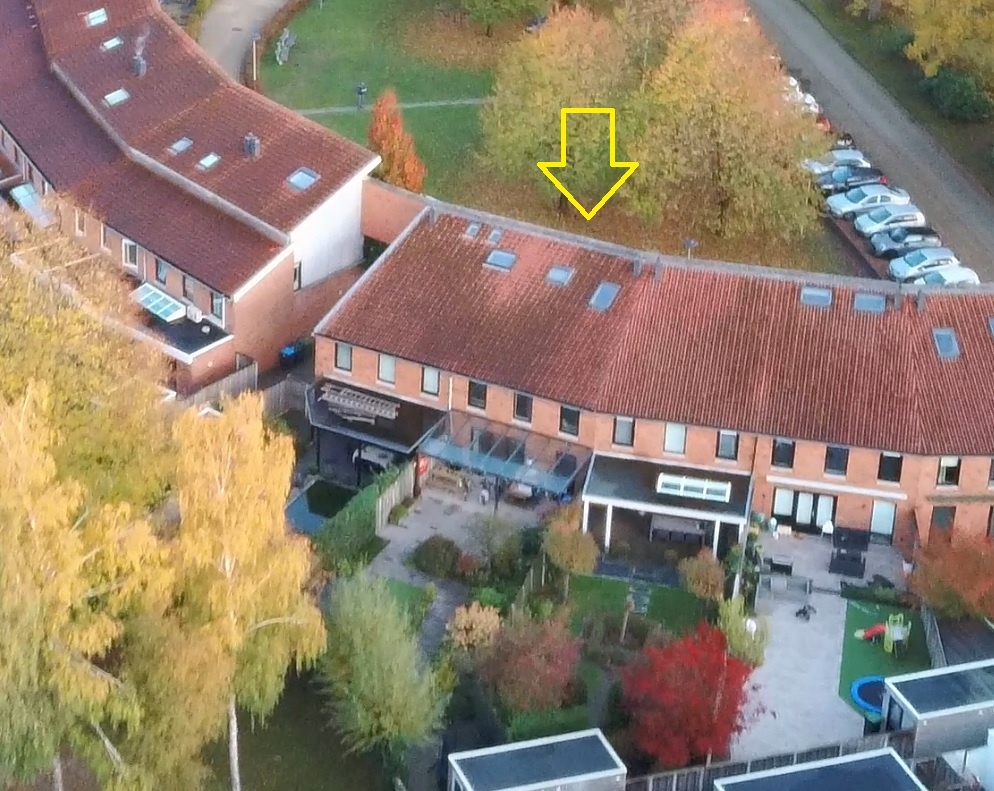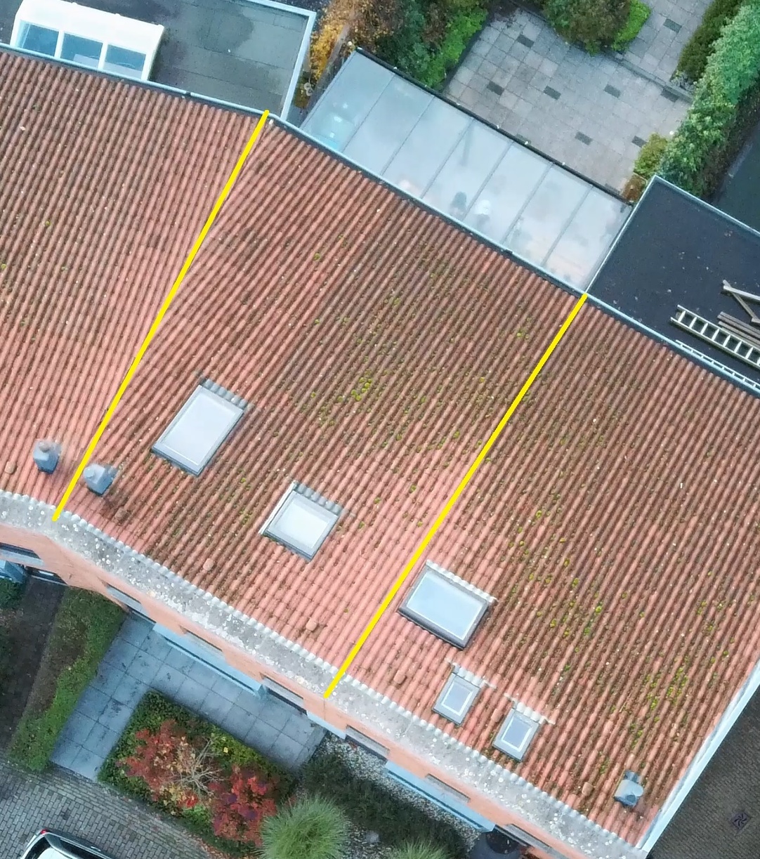 Tweede foto geeft detail van het trapezium vormige dak weer, inclusief twee dakramen en cv-pijp.