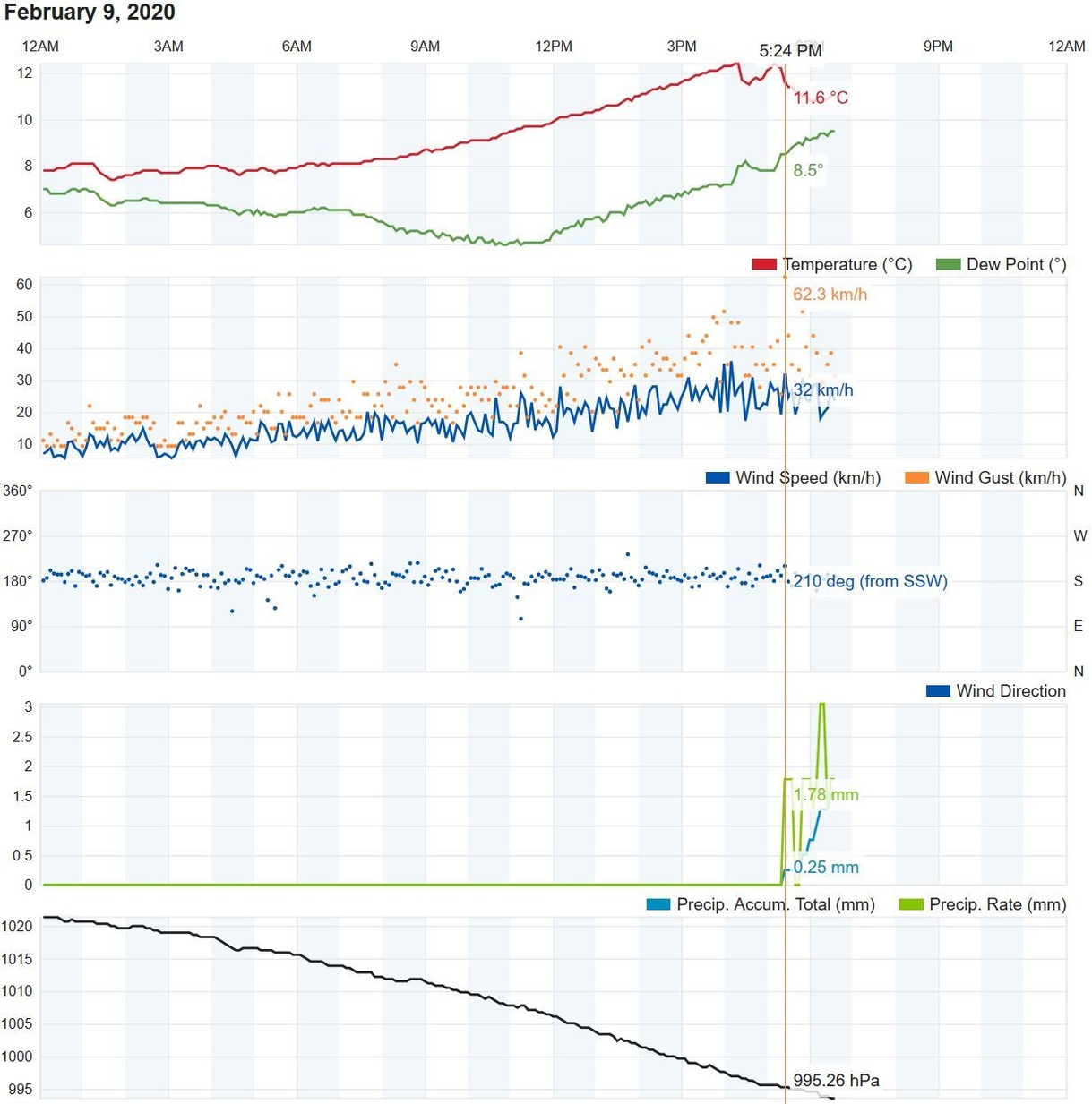 Ik vind het tot nu toe nog wel meevallen. Sterkste windstoot tot nu toe 62,3 km p/u rond 5:24. Verder lijkt het erop dat de wind niet verder toeneemt maar stagneert. Er is wat regen gevallen, maar ook nog maar weinig.