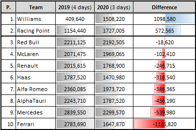 Inderdaad. En we zagen vorig jaar dat Ferrari lang door kon rijden op dezelfde banden op een aantal banen, maar dat bracht ze gewoon erg weinig. Ik denk ook niet dat de teams heel bang zijn, maar het is even afwachten tot ze in de simulator zijn geweest en weten wat het voor hun eigen auto toevoegt. Als het 0,1 seconde per ronde scheelt, zullen ze het vast gaan onderzoeken, maar is de haast niet zo heel groot. Is het een seconde, dan gaat het met spoed en zit het, zoals ik al eerder aangaf, wel snel erop. Maar dan is het aanmaken van een protest goedkoper. Ik verwacht komende week wel wat hierover te horen of men protest wil aantekenen of niet.