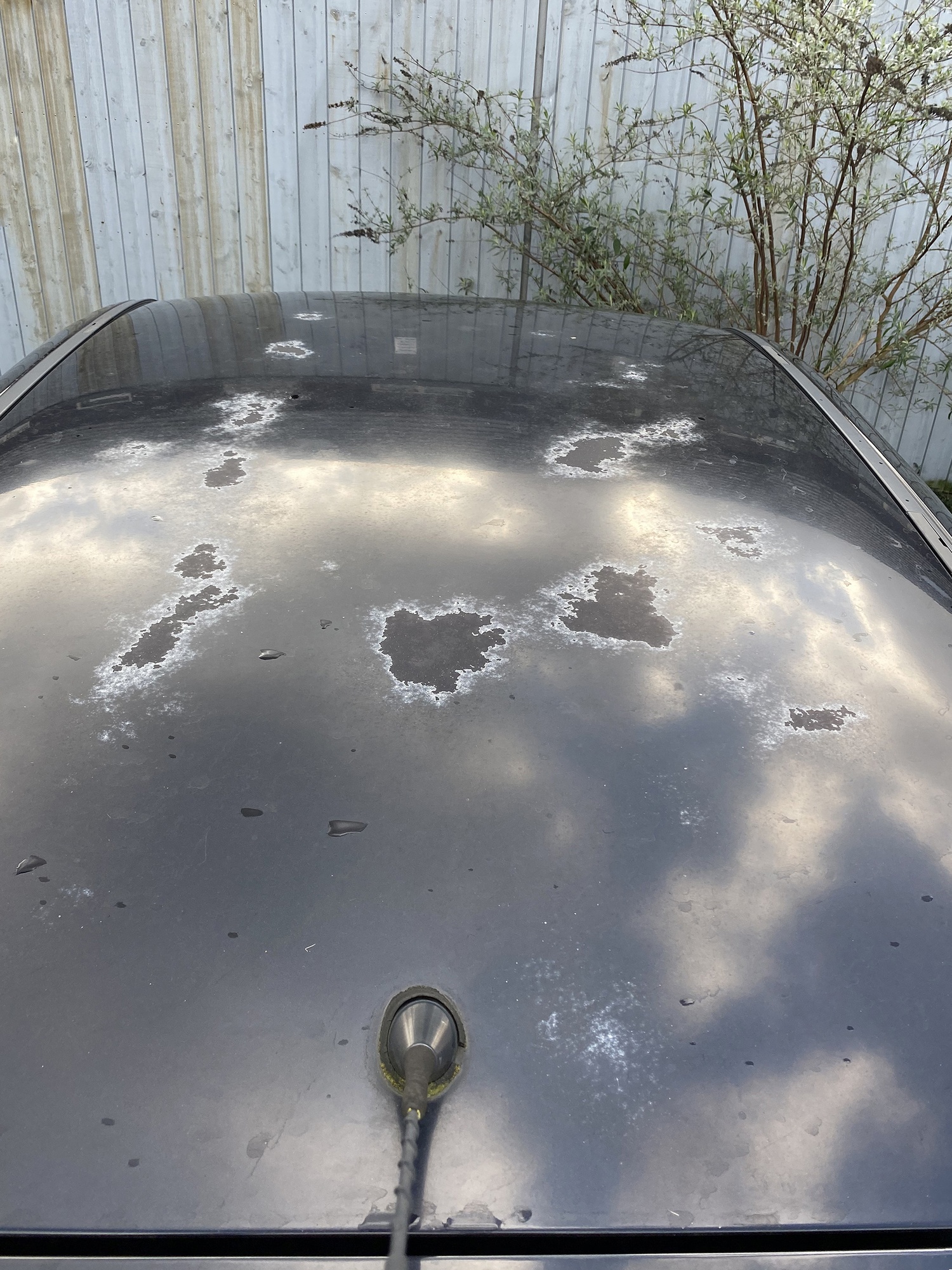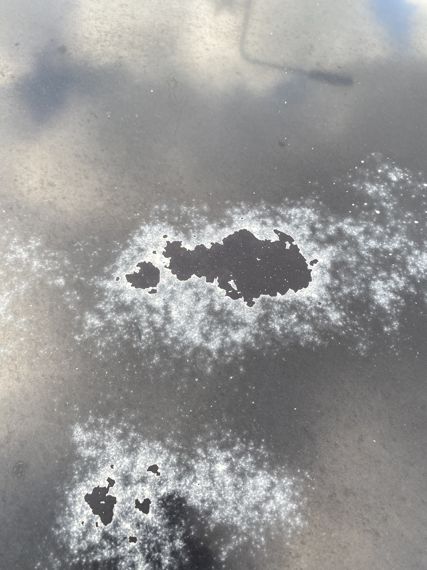 Mijn ouders kwamen net met een bijzondere ontdekking bij hun auto. Op het dak zitten verschillende grote plekken waar het lijkt alsof de lak met een oplosmiddel uitgebeten is. Ik ben even gaan kijken en ik sta voor een raadsel.