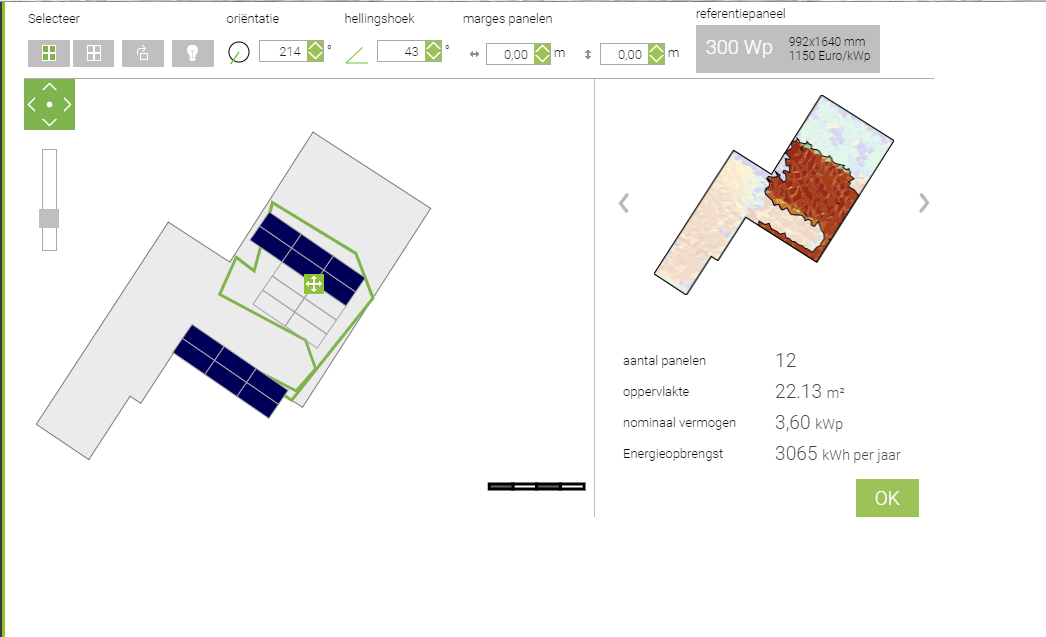 De woning is Z-ZW gelegen (214 graden), de hellingshoek van het dak is ca. 43 graden).