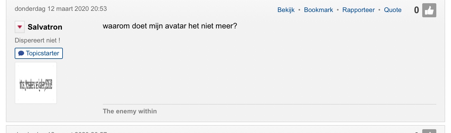 Salvatron z'n avatar heeft als source: https://tweakers.net/i/D2.../icon%201.jpg?f=community, wat mijn browser (Chrome 80 op Windows 10) ook niet kan vinden.