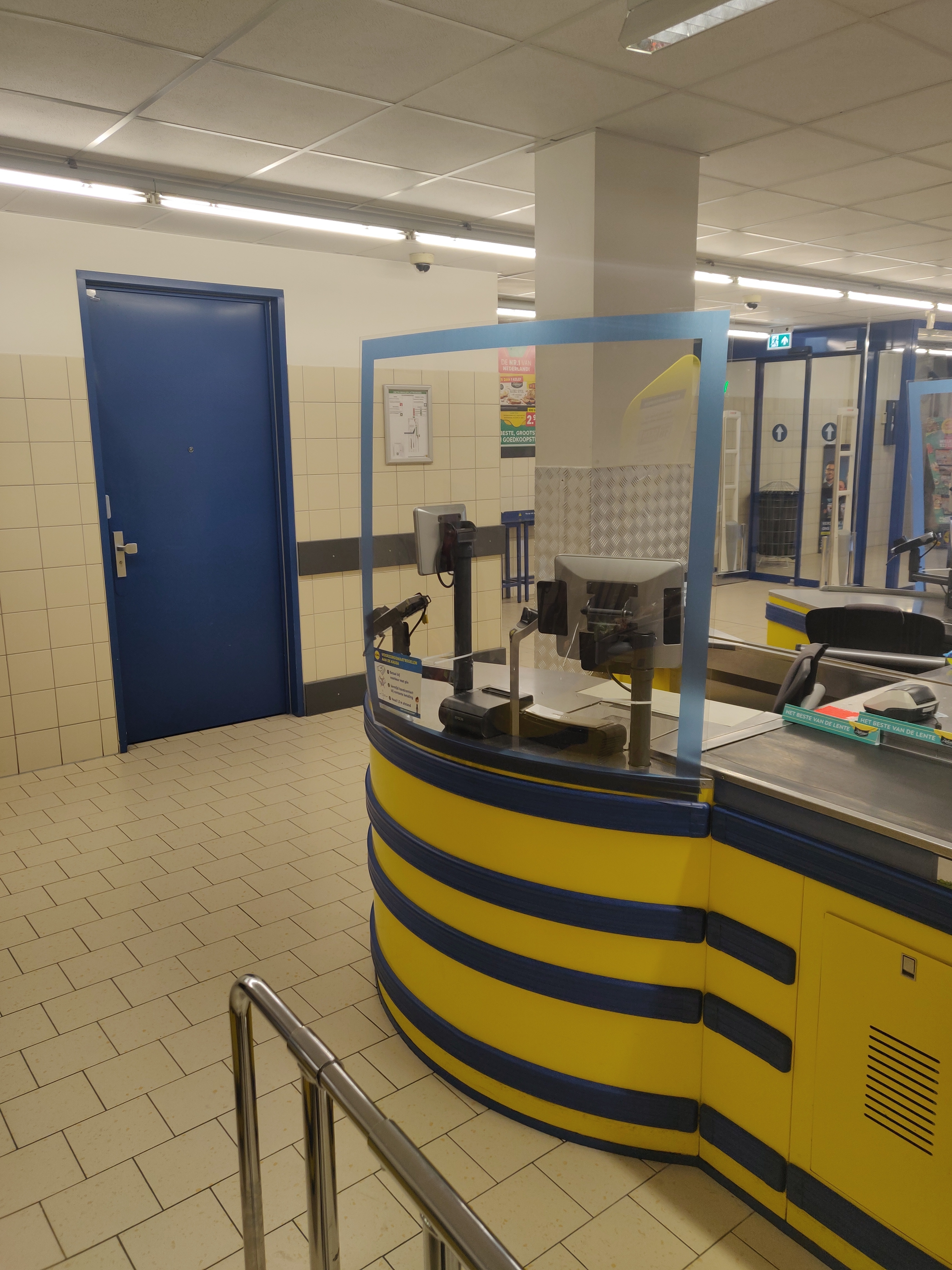 Zoals deze op het stuk waar het scherm hangt, daar staat echt nooit iemand . Mensen. Staan of ervoor spullen op de band te leggen. Of erna want daar kunnen ze de spullen weer inpakken en betalen/pinnen. Dan doet zo'n scherm dus echt niks af en is dat in mijn ogen schijnveiligheid ..