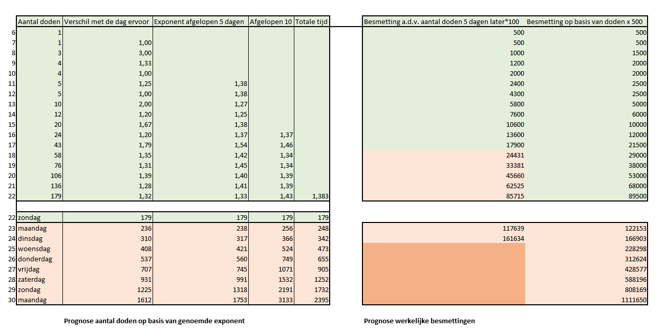 1% verhouding tussen doden en besmettingen is 5 dagen. Dit betekent dat 1% van het aantal besmettingen vandaag het aantal doden over 5 dagen is.