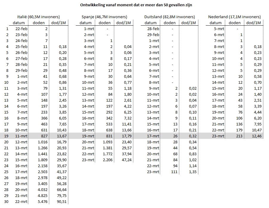 Op het eerste gezicht lijkt dat staatje te bewijzen dat het verloop van de epidemie hier de uitbraak in Italië volgt, met twee weken verschil. De cijfers van eerste week komen angstig overeen. Maar zo simpel ligt het niet. En niet alleen omdat de effecten van de beperkende maatregelen niet zijn meegenomen.