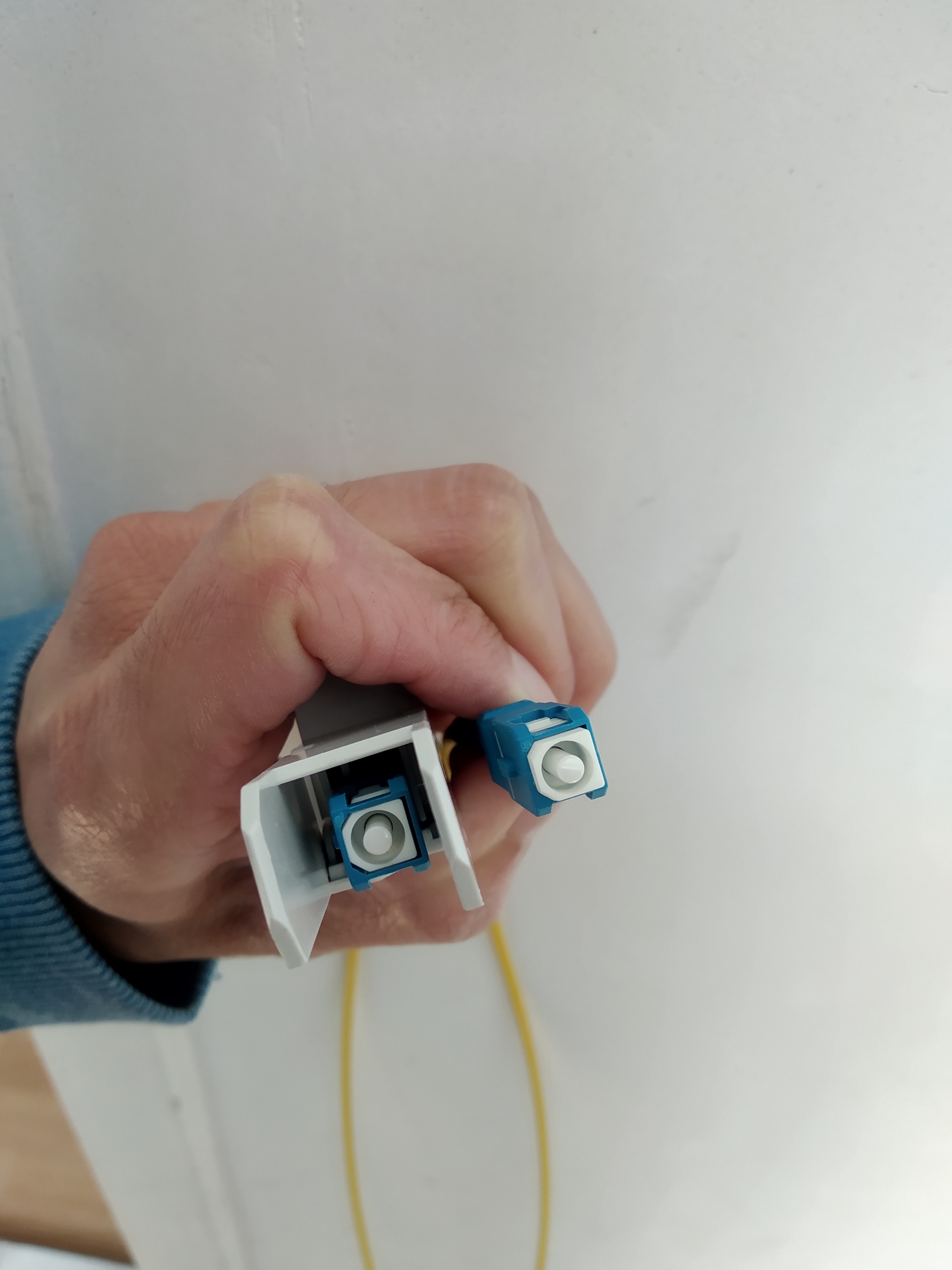 Zoals je op de foto kan zien zit de huidige aansluiting aan de linkerkant, de glasvezel komt aan de rechterkant binnen. Het liefst heb ik het nieuwe modem en media-converter aan de linker kant.