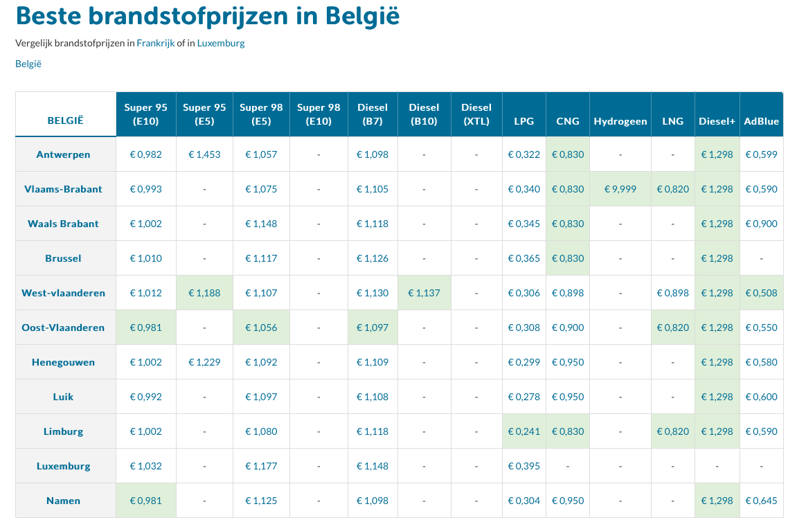 Benzineprijs bij eerste BE tankstation; Euro95 = €1,072