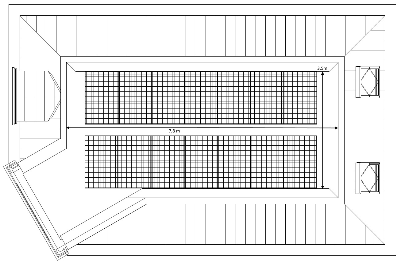 Voor ons nieuwbouwhuis ben ik op zoek naar een oplossing voor maximaal aantal panelen (verwacht jaarverbruik 10.000 kWh door elektrische auto en warmtepomp). Het dak heeft een flinke opstaande rand van ca 40 cm, is het mogelijk om de panelen als volgt te leggen: