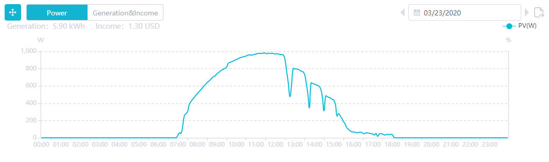 Hieronder de grafiek van mijn PV set waarbij de gehele dag de zon volop scheen en er geen wolkje aan de lucht was. Hierbij is duidelijk te zien dat de set net niet eens de 1000 Watt haalt tijdens de periode dat alle panelen vol in de zon liggen. Naar mijn mening moet dit eerder richting de 2000Watt gaan.Dat de panelen minder opwekken tijdens de schaduw periode is voor mij niet echt relevant. Tijdens deze dag heeft de set 5.9KWH opgewekt, wat ook in vergelijking met andere vergelijkbare sets de helft is.