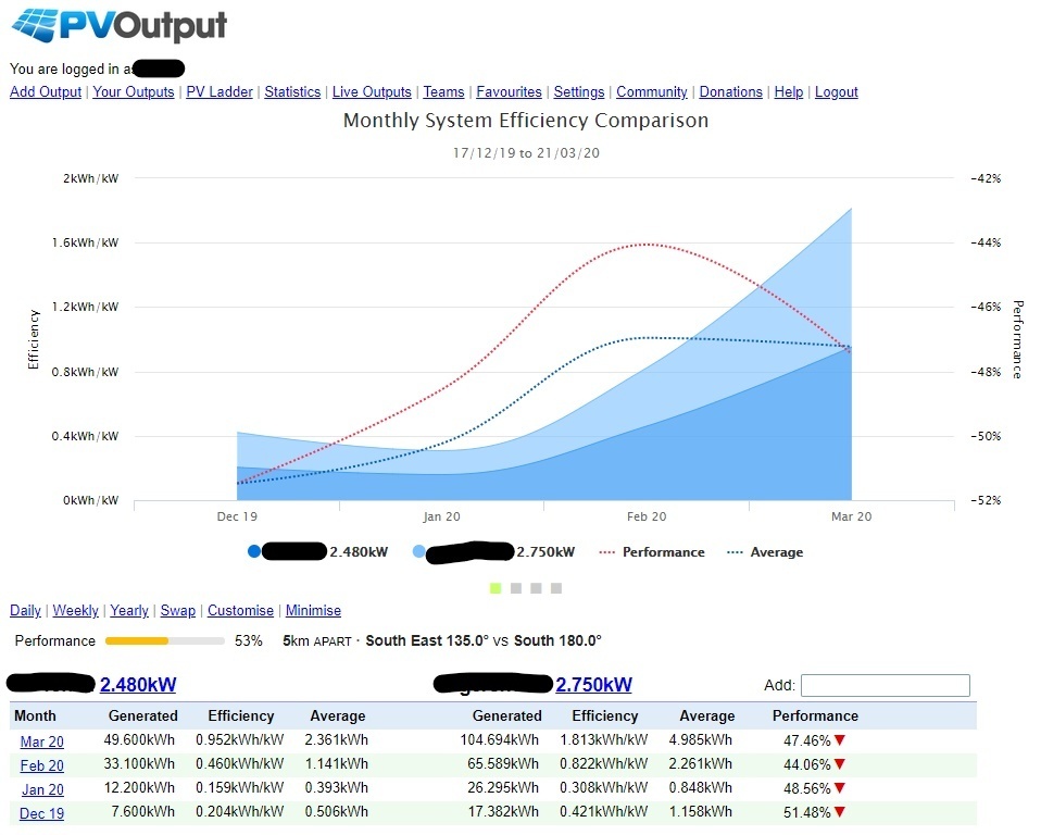 Omdat ik twijfelde ben ik gaan zoeken op PVOutput en heb ik mijn set met een aantal andere eigenaren uit de buurt vergeleken. Dit bevestigde eigenlijk mijn vermoeden dat mijn set ongeveer 50% minder opwekt dan een gelijkwaardige set.