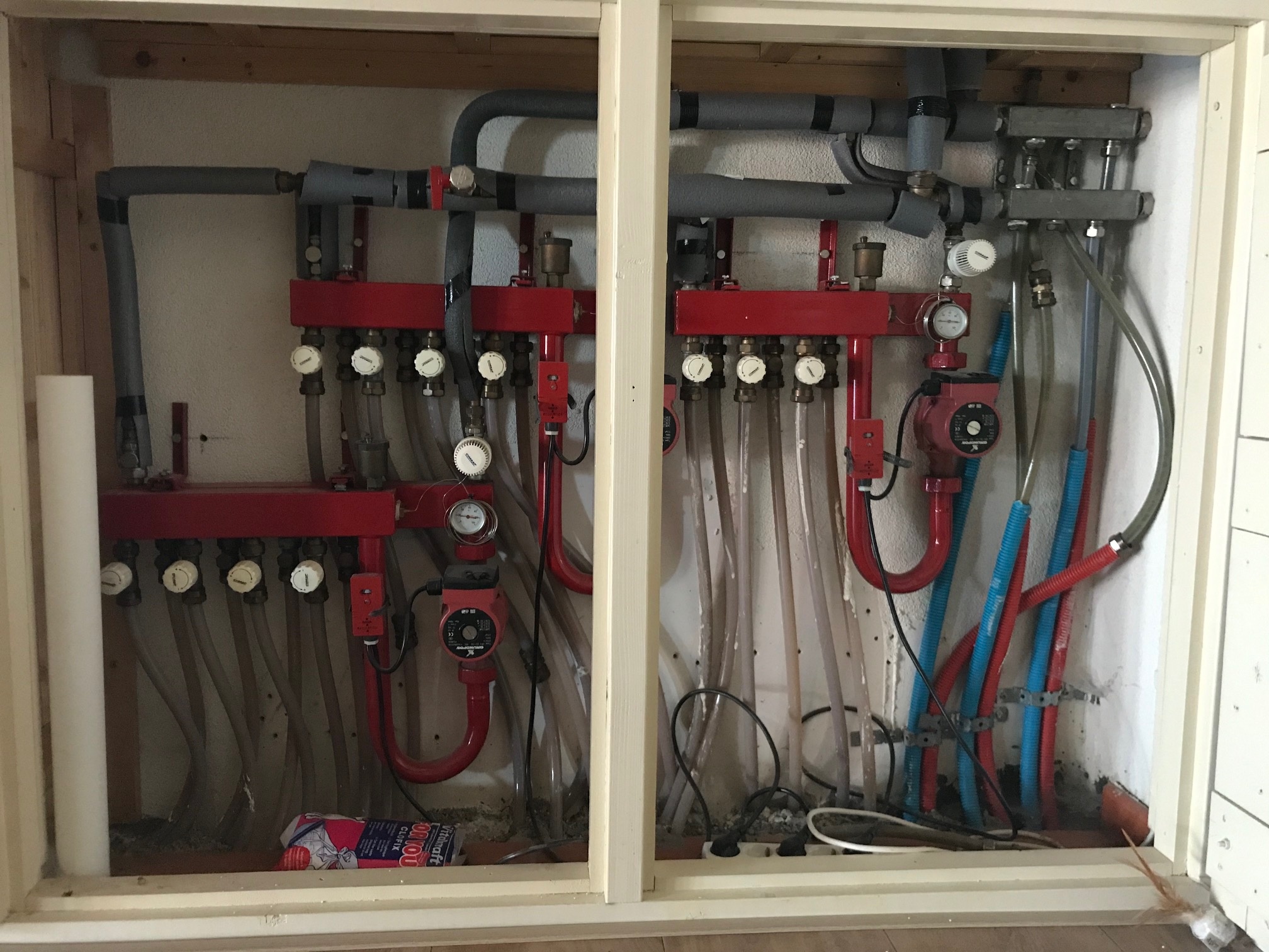 Hieronder de verdeling met 3 pompen; op de verdieping erboven bij de CV is nog een 4e pomp. Ik wil die door nieuwe, moderne pompen vervangen want ik gebruik de vloerverwarming eigenlijk nooit.