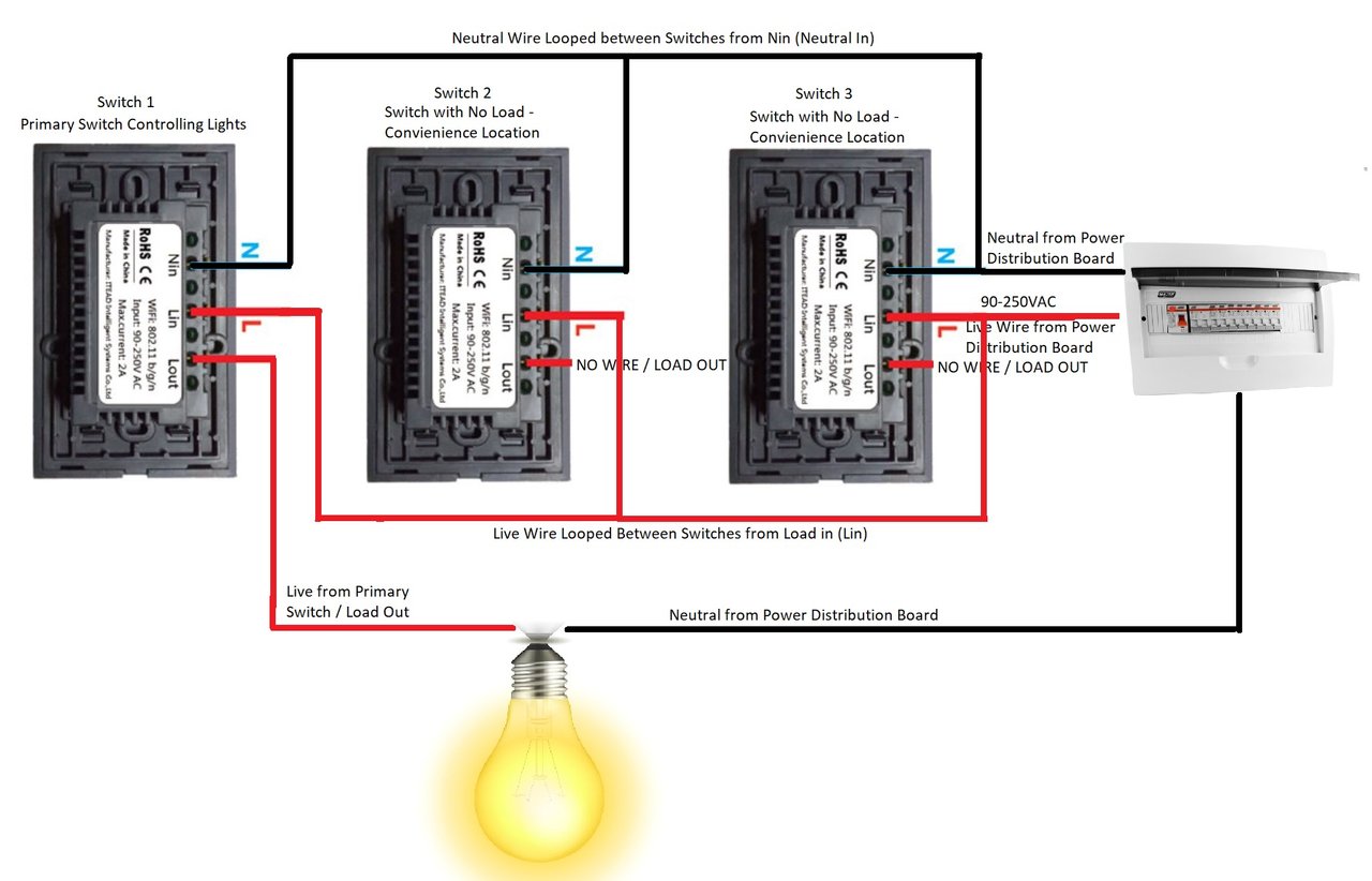 Ik zou deze graag vervangen door Sonoff touch schakelaars, maar dat soort schakelaars hebben steeds een blauwe draad nodig zoals in onderstaande afbeelding: