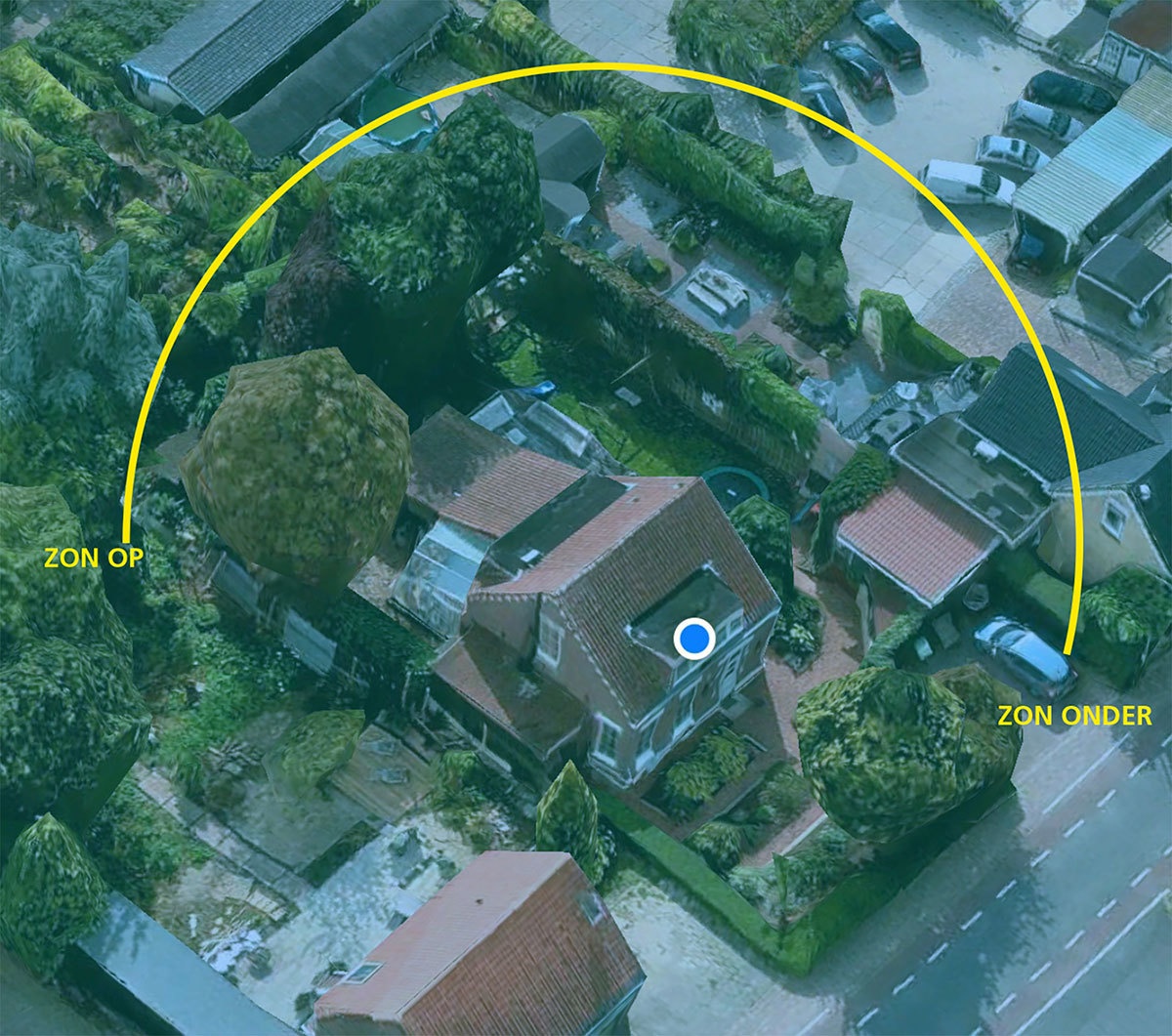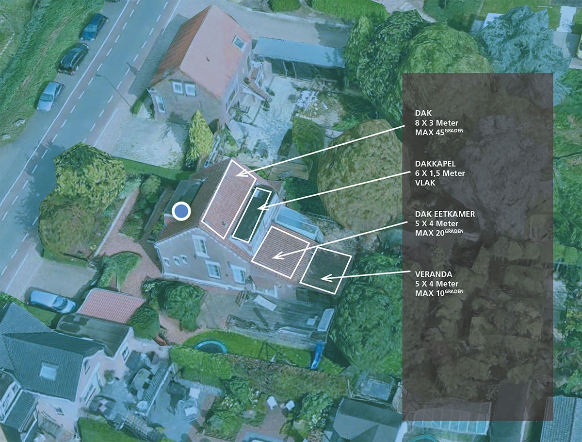 jaarproductie van 6950kWh (windrichting O / 112°) leveren,