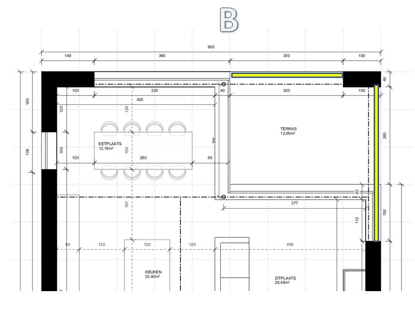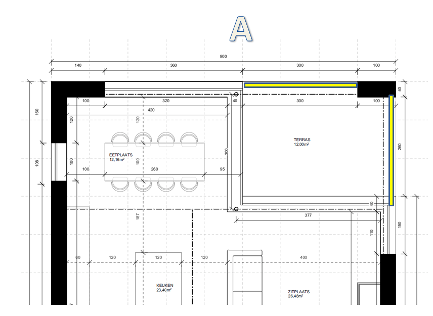 Optie A = 2 rolluiken laten doorlopen naar de buitenmuur, met als voordeel dat je minder brede rolluiken nodig hebt. En dat je ook geen zorgen moet maken over je EPB want die rolluiken zitten buiten je schil. Raam in westen blijft ofwel zonder rolluik ofwel apart rolluik aan raam.