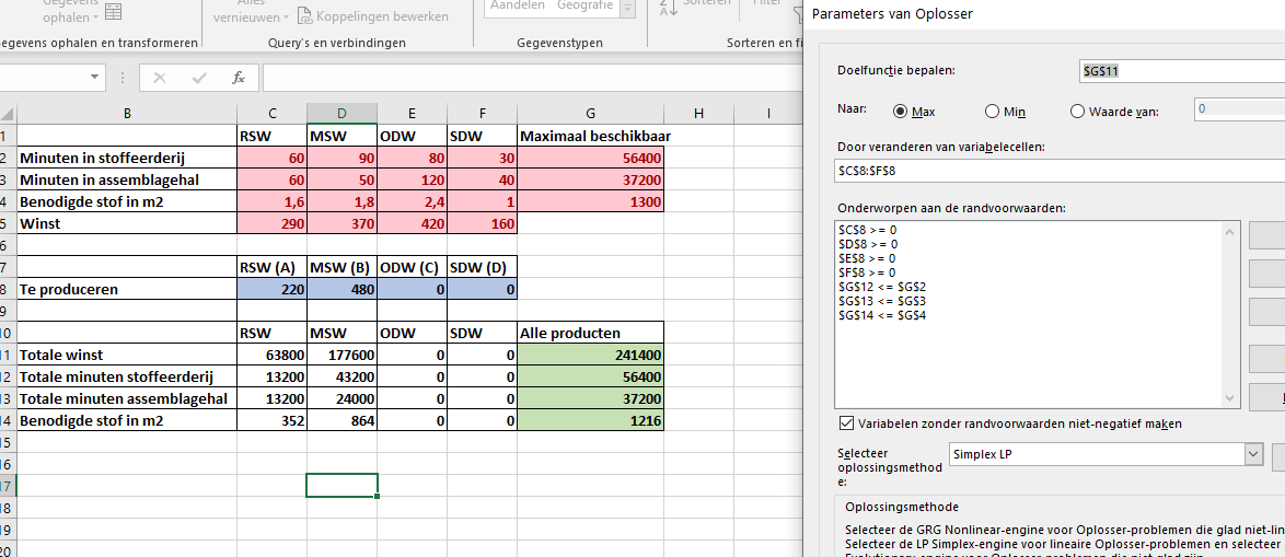 Het probleem is dat er 4 producten te produceren zijn en daar de maximale winst over bepaald moet worden. er is een maximum gegeven aan beschikbare materialen en er is bekend hoeveel winst er per product gemaakt wordt. Nu pas ik de solver toe en berekent hij maar voor de eerste twee producten het optimum en de rest laat die op 0 staan.
