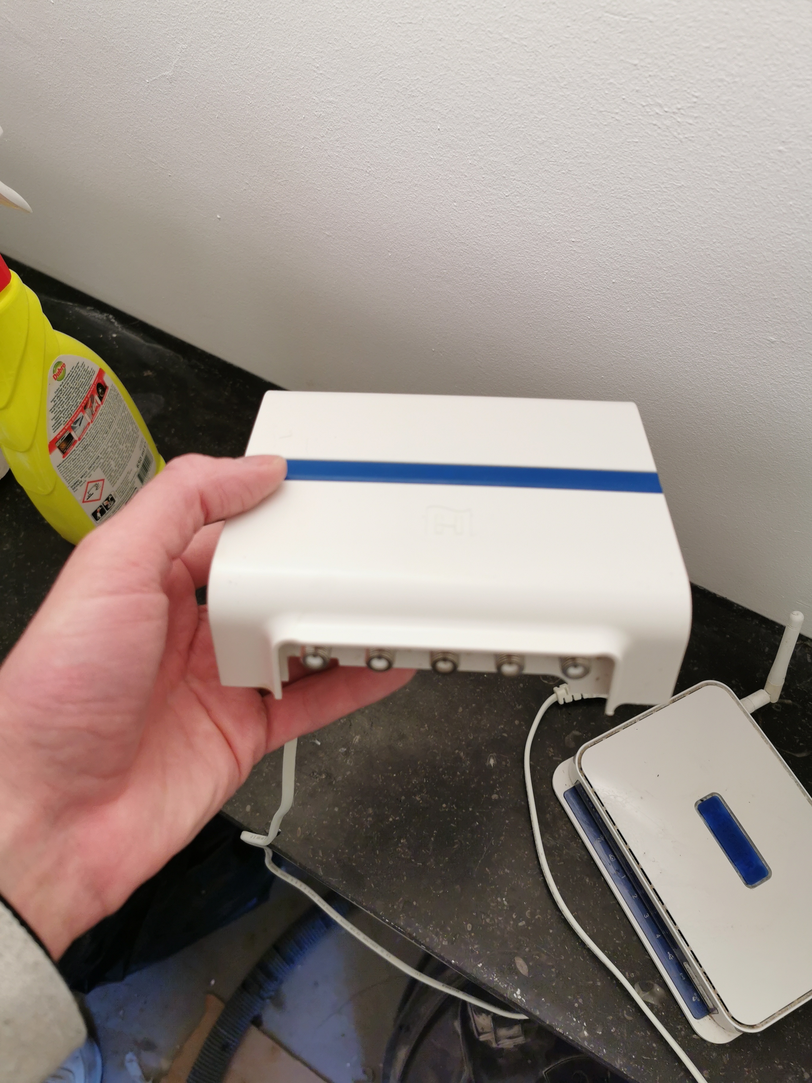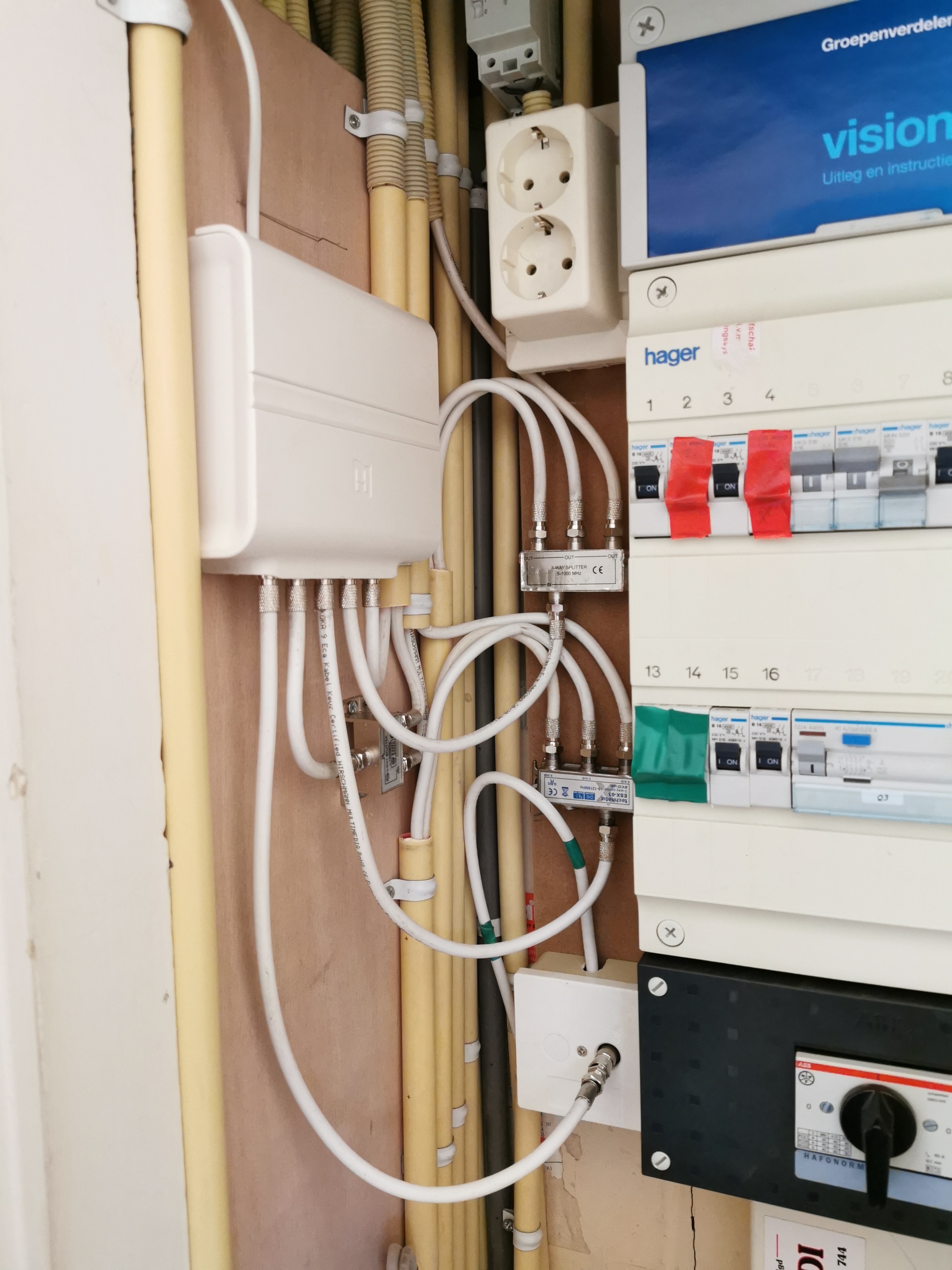 Ik sta middenin de verhuizing van mijn broer, die mij gevraagd heeft om zijn modem en wireless router aan te sluiten in het nieuwe huis. In het nieuwe huis zijn alle aansluitingen in gebruik voor bekabeld internet. De kabel is meerdere keren gespit en er zit een CATV amplifier tussen. Er is geen uitgang voor het modem over en mijn broer heeft geen splitters, maar in de verhuisdoos van mijn broer zie ik wel een tweede CATV amplifier liggen. Kan ik die ertussen zetten zodat er ruimte komt voor modem of geeft dat problemen?