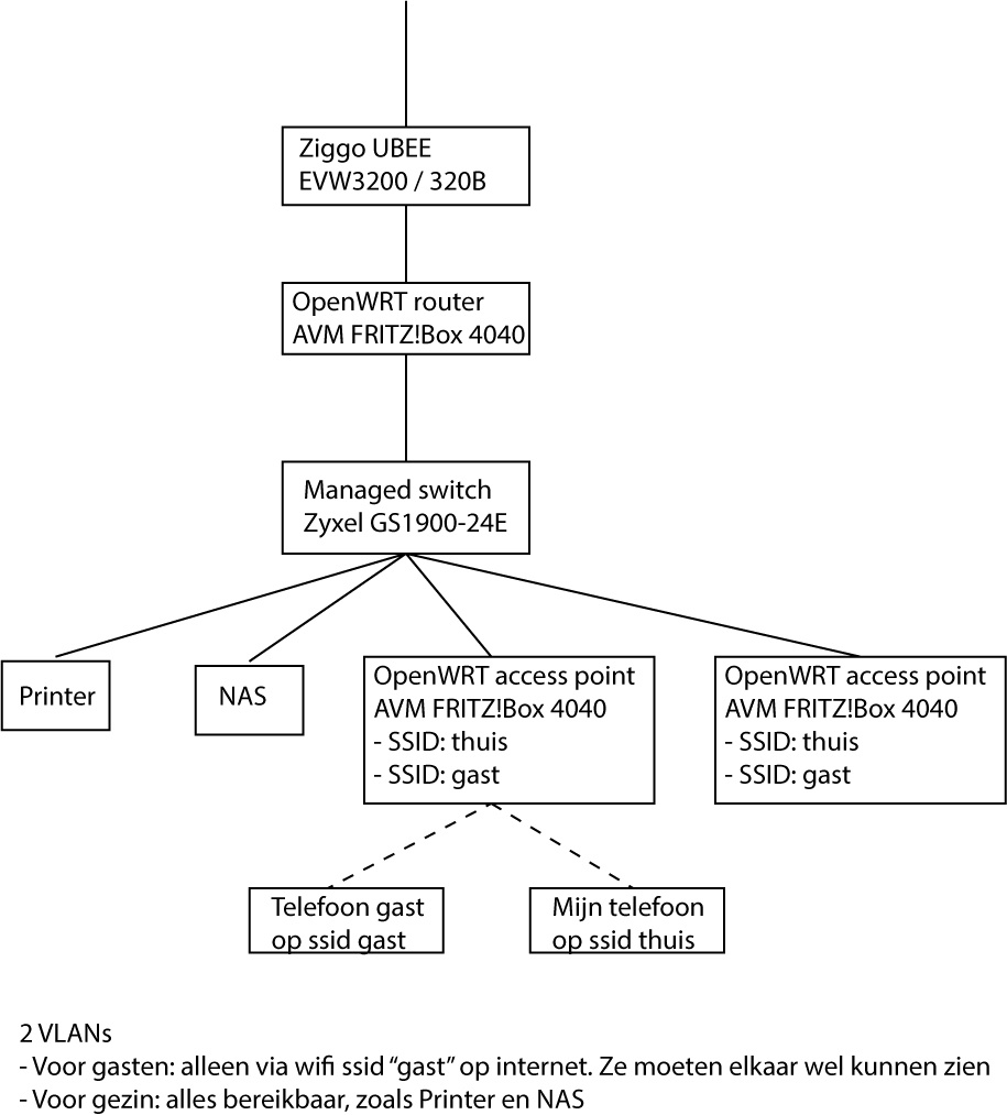 Nu is dit een leuk hobby projectje. Ik weet zelf nog heel weinig van VLANs. Waar ik naar op zoek ben is een stappenplan op hoofdlijnen. Kan dit uberhaupt met deze hardware? De ziggo modem ondersteunt in ieder geval geen VLANs. Wat moet ik ongeveer op welk apparaat instellen?