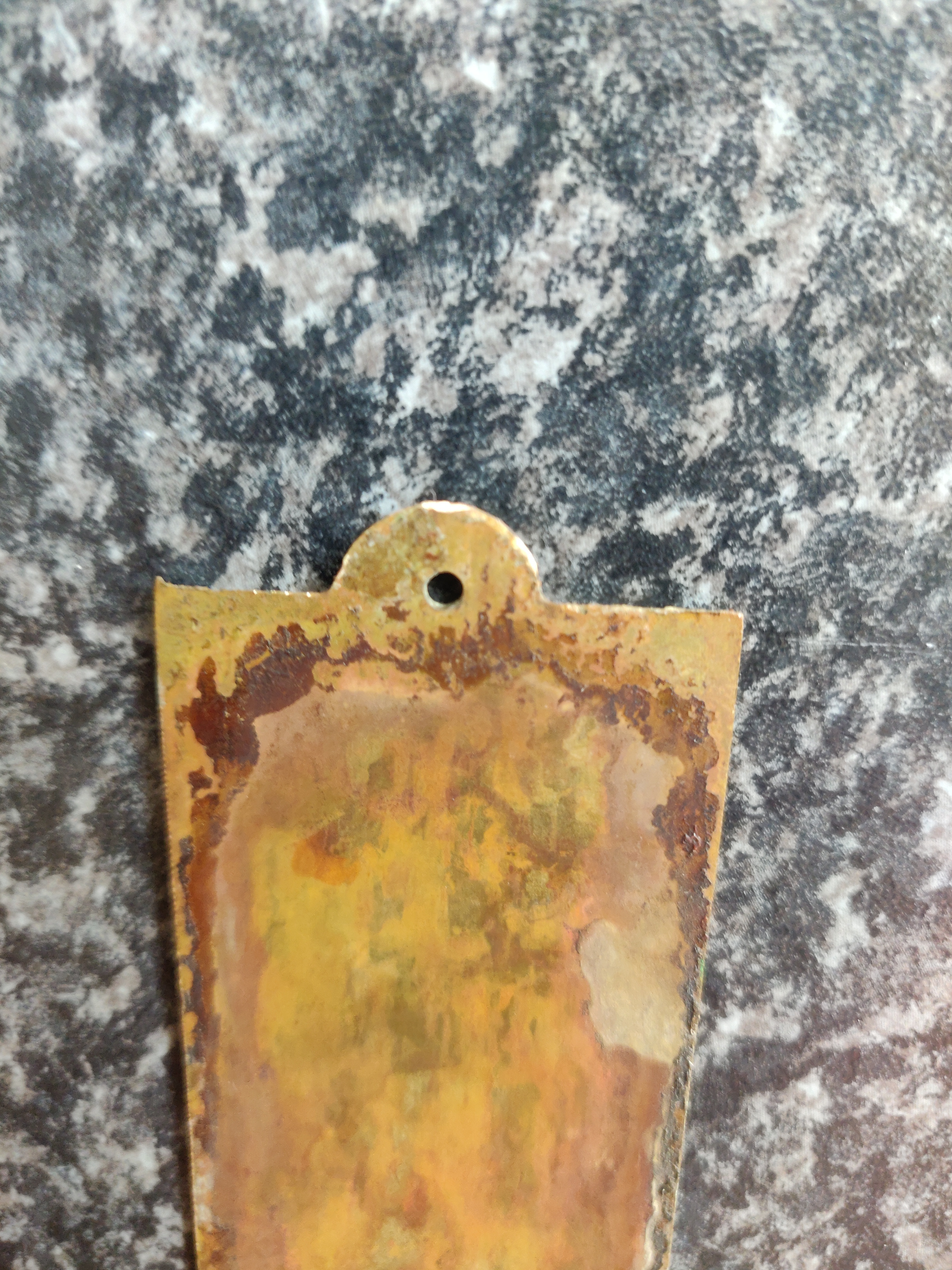 Mijn huis is verkocht, dit was ook mijn ouderlijk huis en op de voordeur zat ook al die tijd nog het naamplaatje van mijn ouders op. Ik vermoed dat deze minimaal 35 jaar oud is. Als aandenken haal ik deze eraf en wil ik hem een beetje schoonmaken.