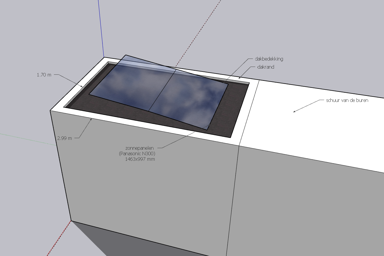 Belangrijkste beperkende factor is het beschikbare oppervlak. Van de breedte van 2 meter kan ik door een rand slechts maximaal 1,7 meter gebruiken. Dit limiteert de panelen die we kunnen toepassen.