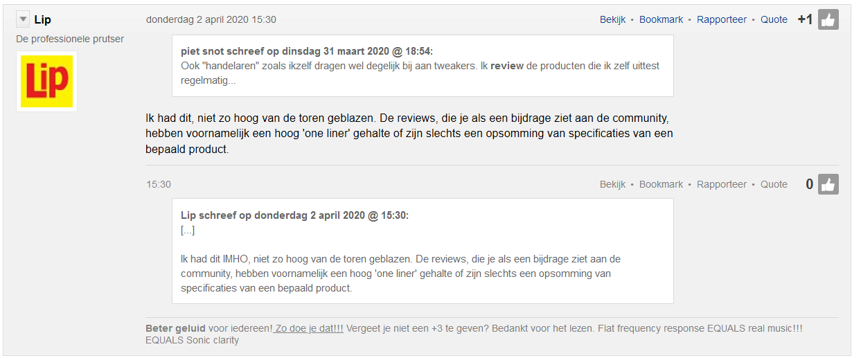 Ik had dit, niet zo hoog van de toren geblazen. De reviews, die je als een bijdrage ziet aan de community, hebben voornamelijk een hoog 'one liner' gehalte of zijn slechts een opsomming van specificaties van een bepaald product.