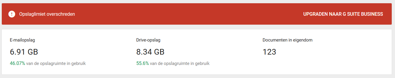 Binnen de beheerconsole van Google apps wordt aan de ene kant aangegeven dat de opslagruimte gebruikt wordt voor ongeveer de helft, maar tegelijk dat er ruimte tekort is.