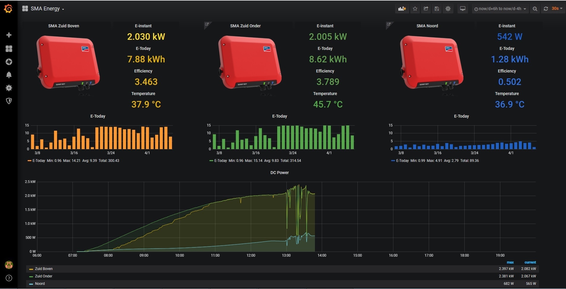 Schaduw In de ochtend valt een beetje schaduw op het paneel rechtsboven door de schoorsteen. De pijpjes in rij 2 kunnen ook wat schaduw veroorzaken op de panelen links en rechts. De panelen op de onderste rij kunnen hartje winter ook wat schaduw hebben als de zon laag staat door het dak van de buren.