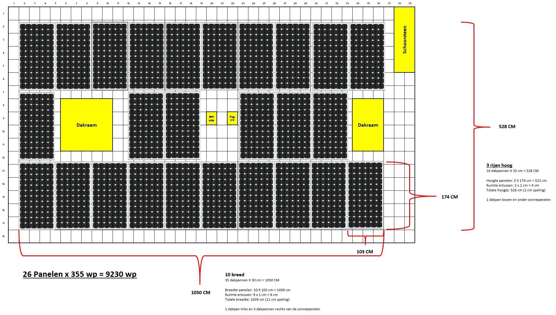 Met dit paneel kan ik het dak efficient vullen en heb ik rondom 1 dakpan ruimte over (rechts meer). Totaal 26 panelen x 355 WP = 9230 WP