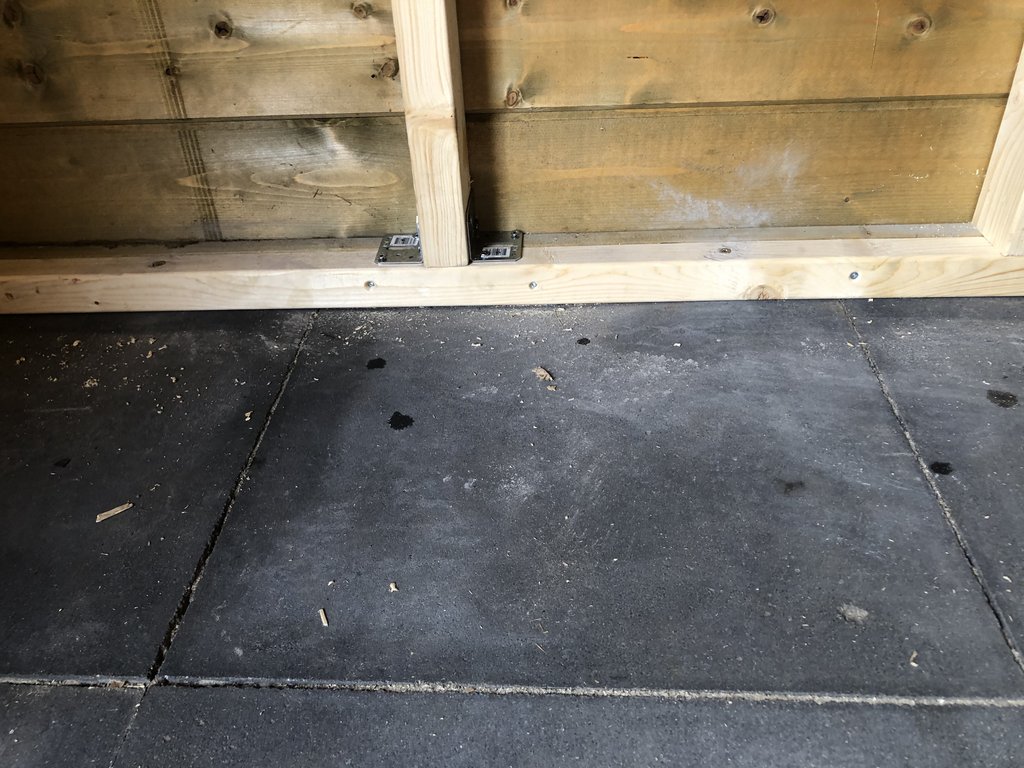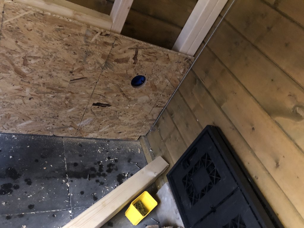 Omdat ik één van de balken waar de poten uit moeten komen al had gevlakt op de Metabo toen die stuk ging, heb ik met de handschaaf de andere maar op dezelfde dimensies gebracht. Natuurlijk werd dat een ongelofelijke zwijnestal. Mijn afzuiging is te lomp en zwaar (niet te vergeten een te korte slang) op hierop te passen en het opvangzakje dat erbij hoort is natuurlijk niet bruikbaar met deze hoeveelheden, dus we nemen een stofmasker en het opruimwerk maar op de koop toe.