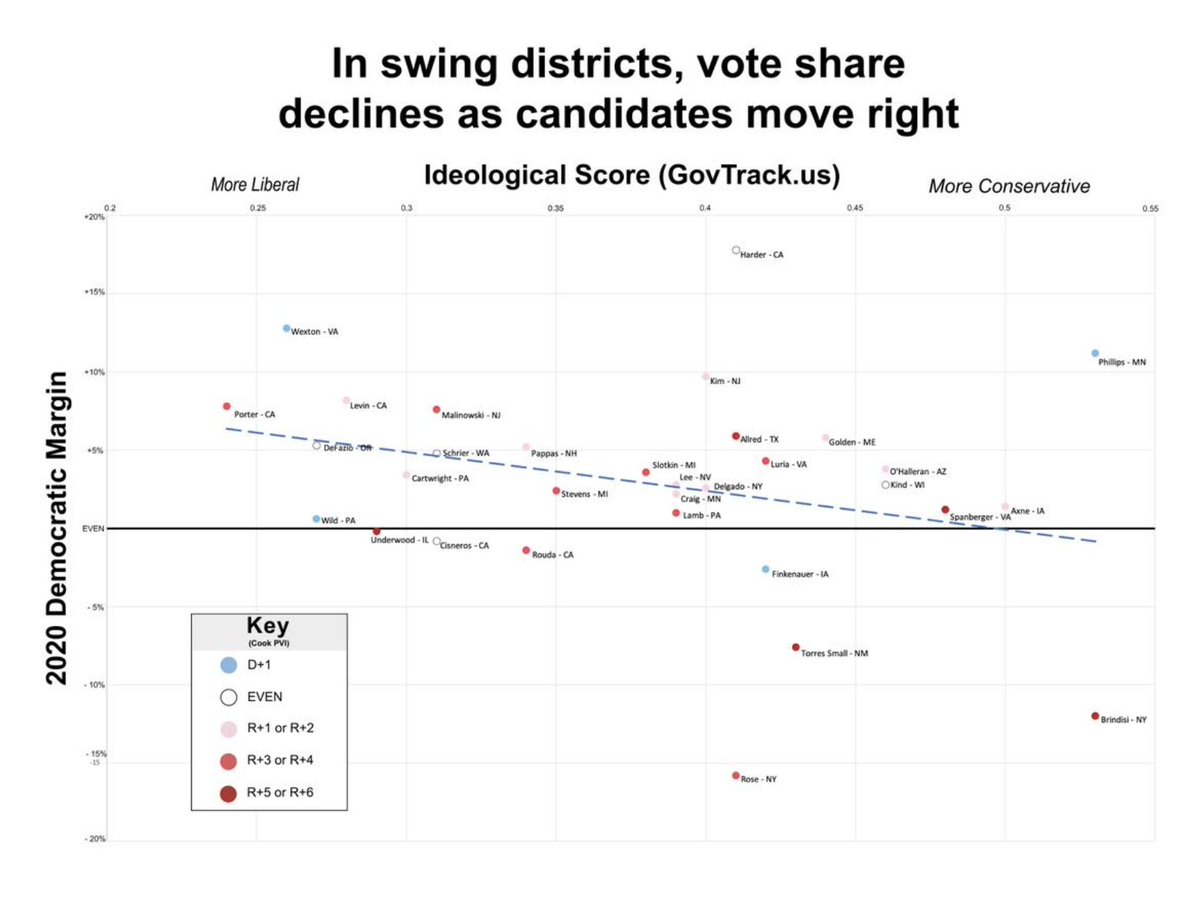 Klopt, maar het probleem daarbij is wel dat je het op twee verschillende manieren kan uitleggen. Hebben de conservatievere Democraten het minder goed gedaan omdat ze niet progressief genoeg zijn voor hun district of omdat ze voor hun district niet conservatief genoeg zijn (waarbij ik ook even de mogelijkheid reken dat progressieve standpunten die zij niet delen door de kiezers wel aan hen worden toegerekend)? Hetzelfde geldt voor deze analyse die kennelijk afkomstig is van de Justice Democrats en de Sunrise Movement:Spookelo schreef op dinsdag 10 november 2020 @ 15:19: