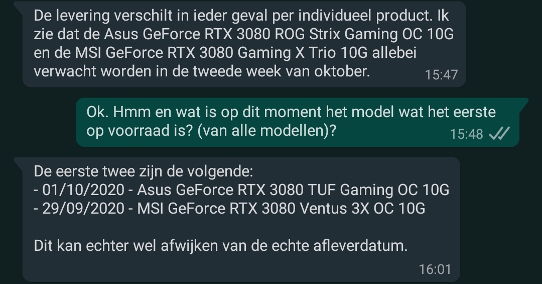 Ik heb bij Azerty besteld en nog niets binnen gekregen ik heb de ASUS TUF 3080 OC besteld rond 16:00DionDV schreef op maandag 28 september 2020 @ 00:29: