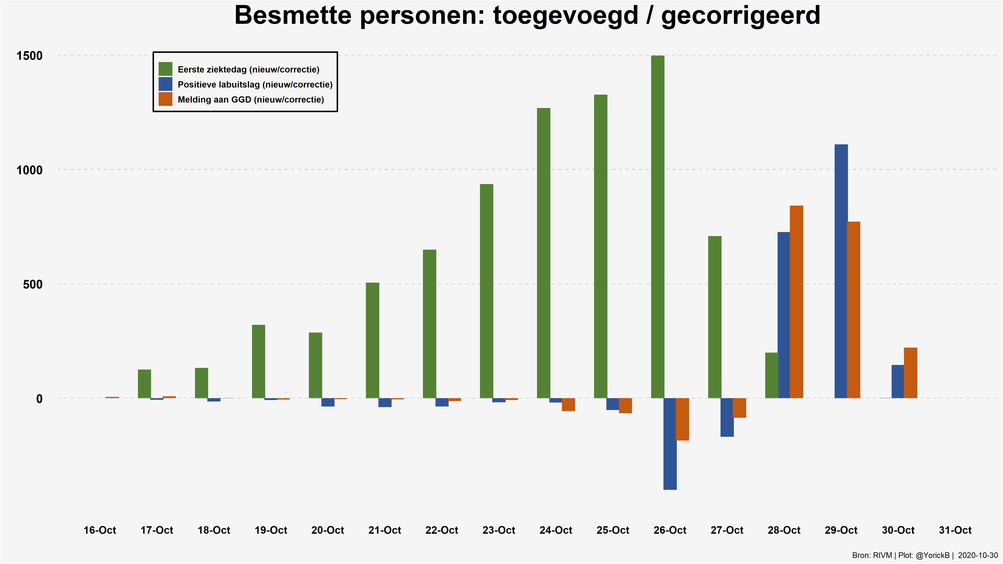 Waar je alleen nog even rekening mee moet houden is dat de dagen die nog rood gestippeld zijn in de grafiek van @breew , nog kunnen stijgen. Die dagen zijn namelijk nog niet compleet. Vanaf 10 dagen geleden en ouder is wel nagenoeg compleet, daar komt niet veel meer bij.Holk schreef op vrijdag 30 oktober 2020 @ 15:19: