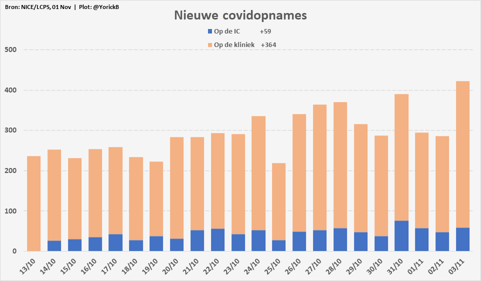 Nou ja, we weten inmiddels ook al dat dingen als ziekenhuis opnames en IC opnames qua stijgen en/of daling altijd 7-14 dagen achter lopen op de stijging/daling van het aantal besmettingen. Vrijwel niemand wordt ziek/positief getest en ligt meteen die dag of de dag erna in het ziekenhuis, daar gaan meestal een aantal dagen overheen. In mindere mate ook met de doorstroom van een reguliere ziekenhuis opname naar een IC, in het ergste geval ga je er direct heen maar de kans is groter dat je eerst enkele dagen op een normale afdeling ligt alvorens je (helaas) naar de IC moet.MikeyMan schreef op dinsdag 3 november 2020 @ 14:22: